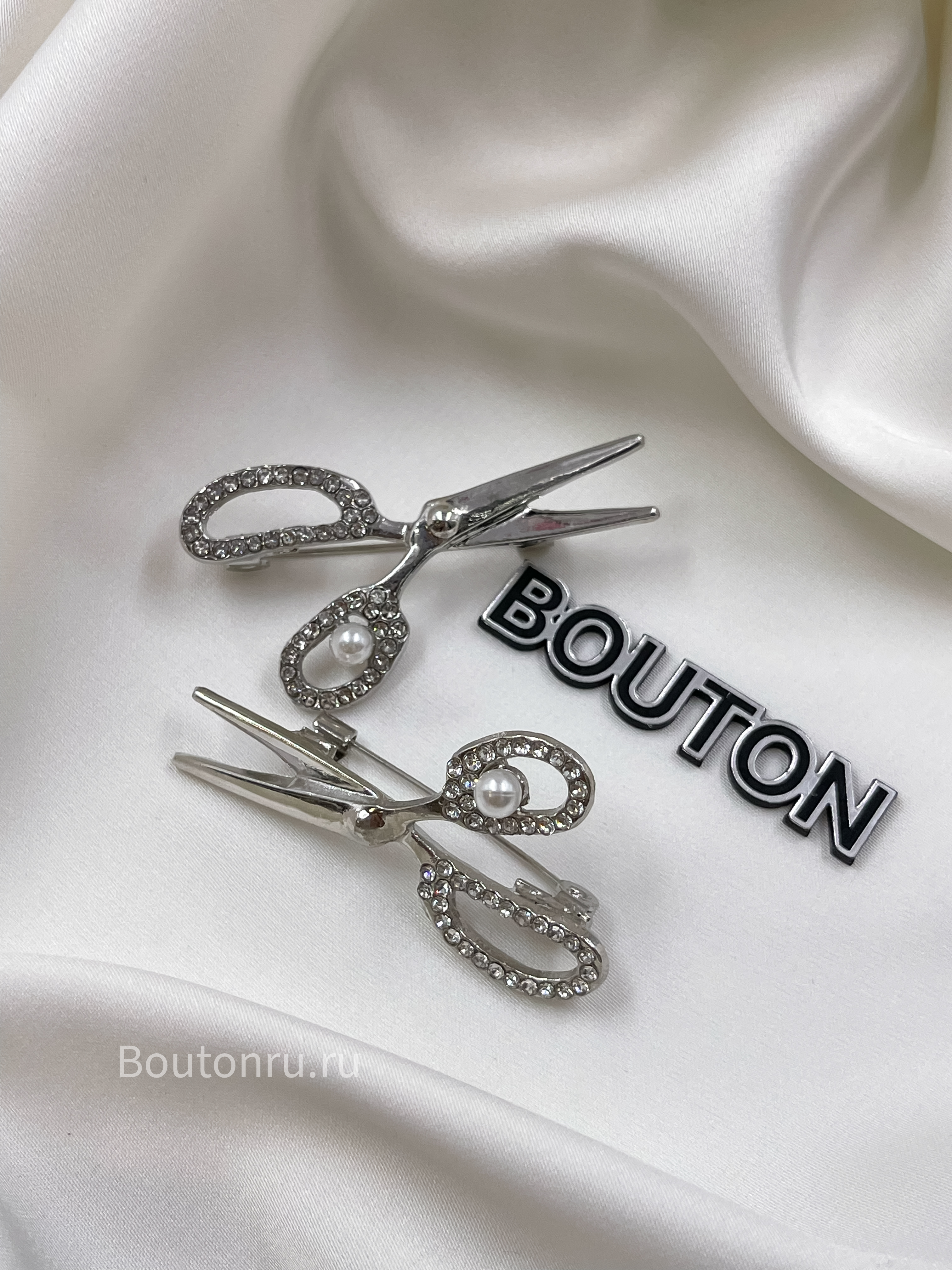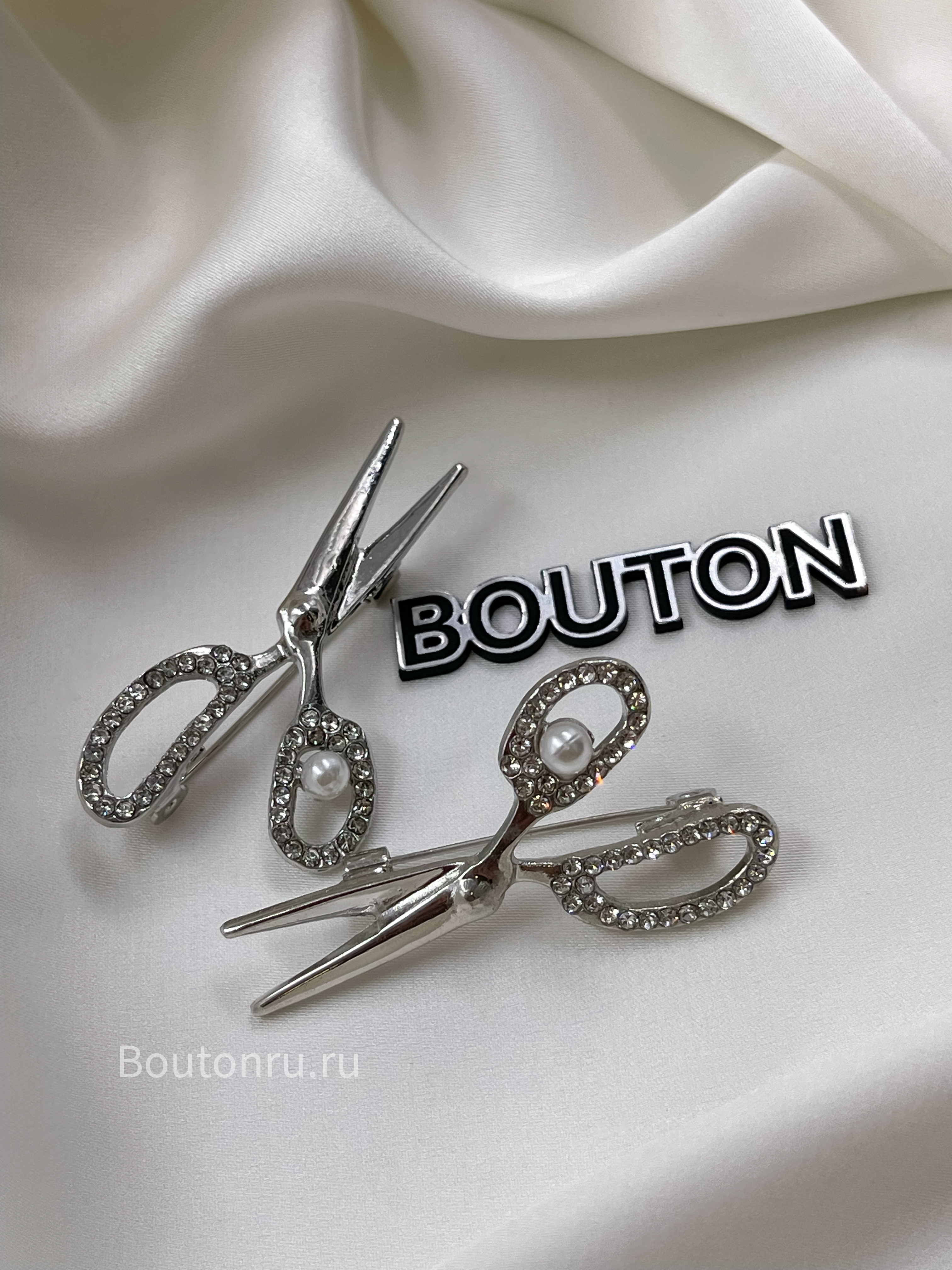 Брошь серебристая "Ножницы" со стразами и жемчугом