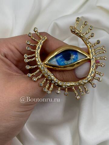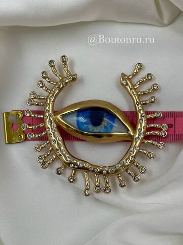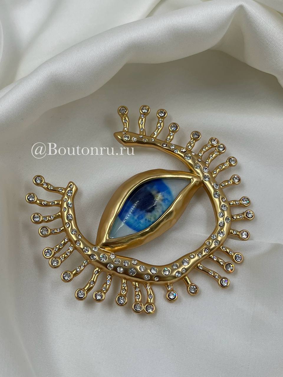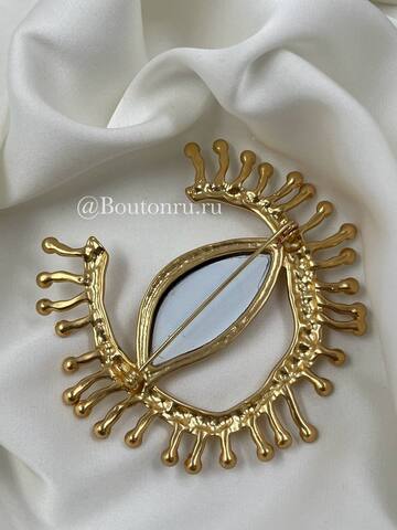 Брошка из золотистого металла, вокруг глаза, расположены декоративные элементы напоминающие реснички