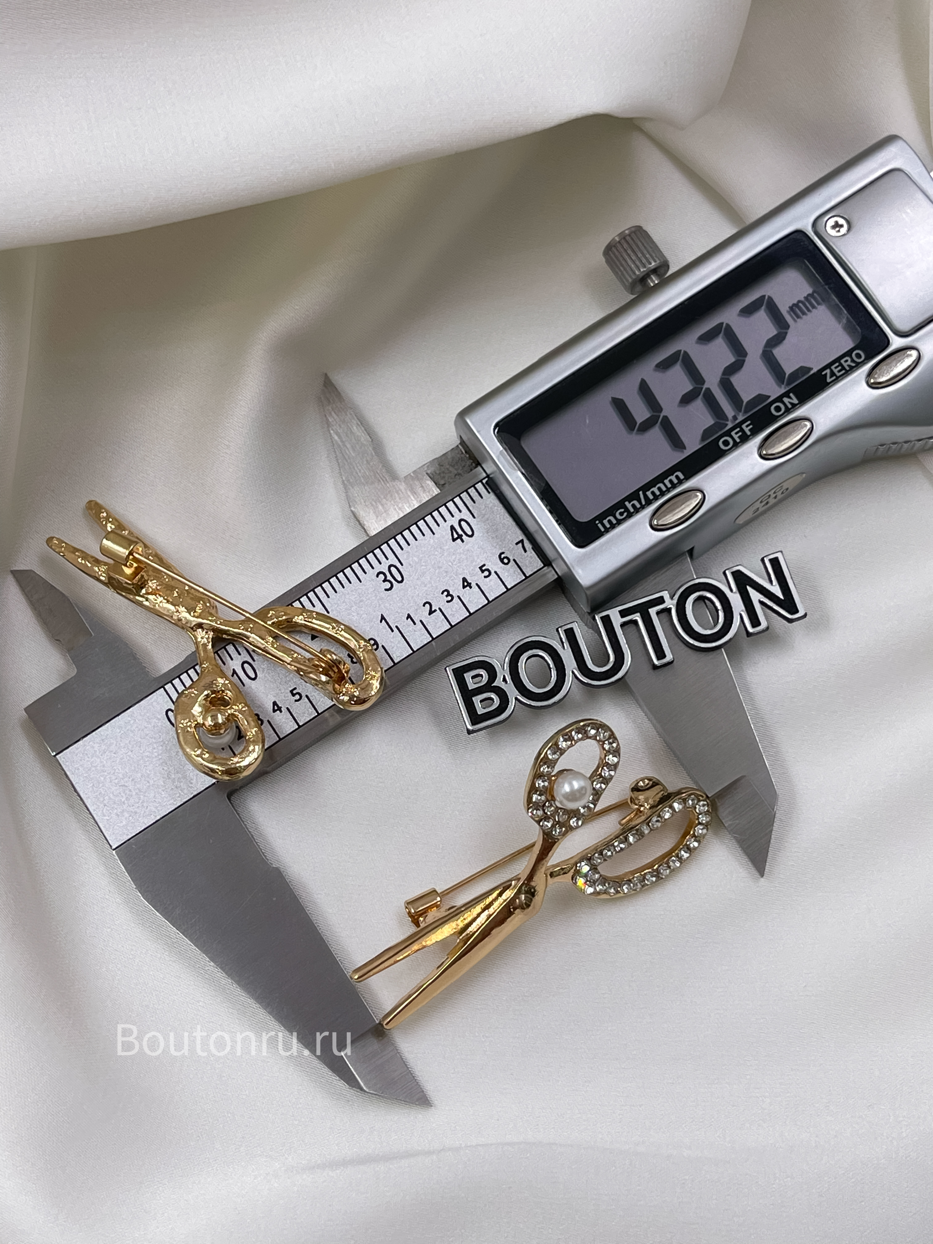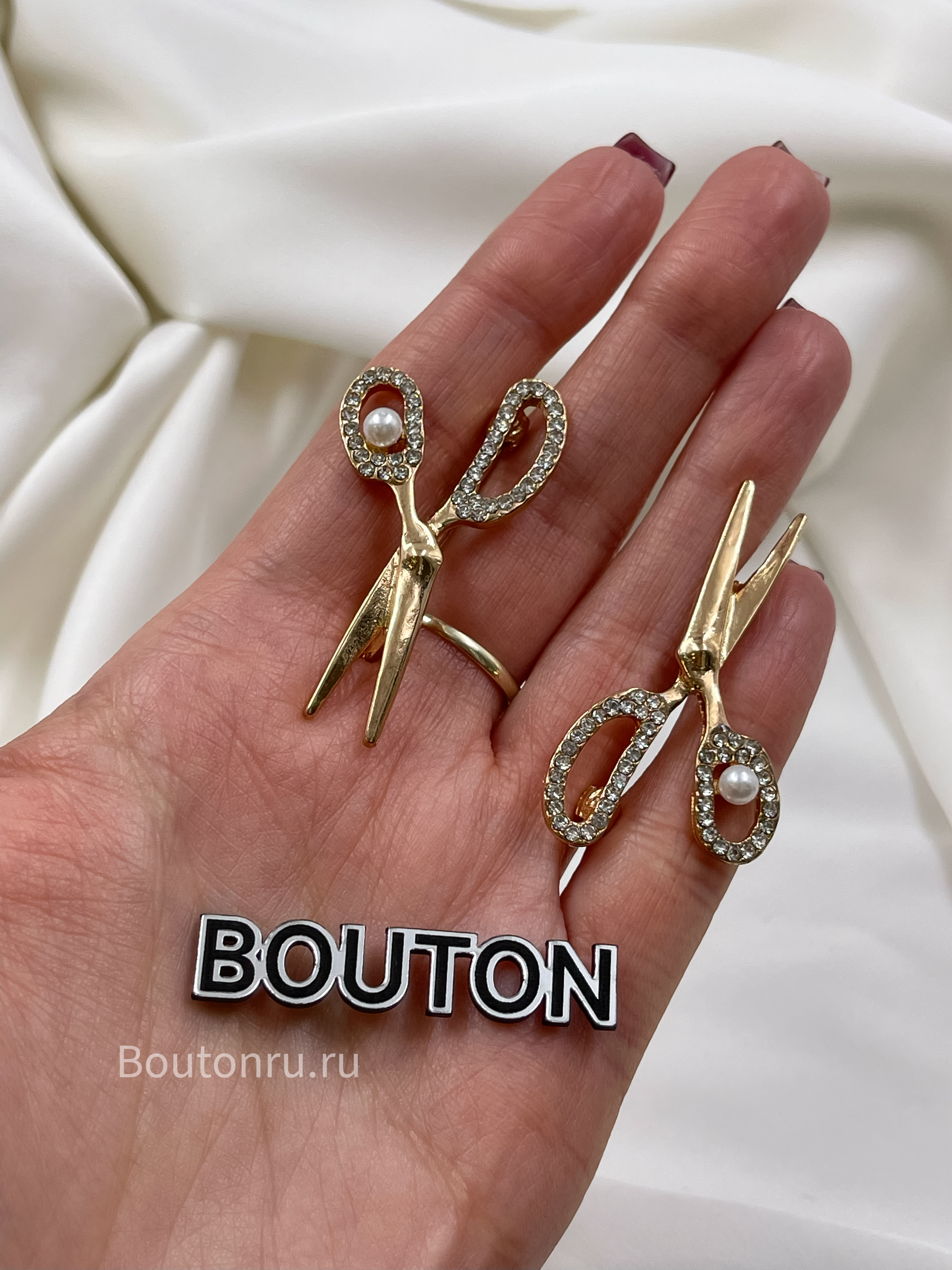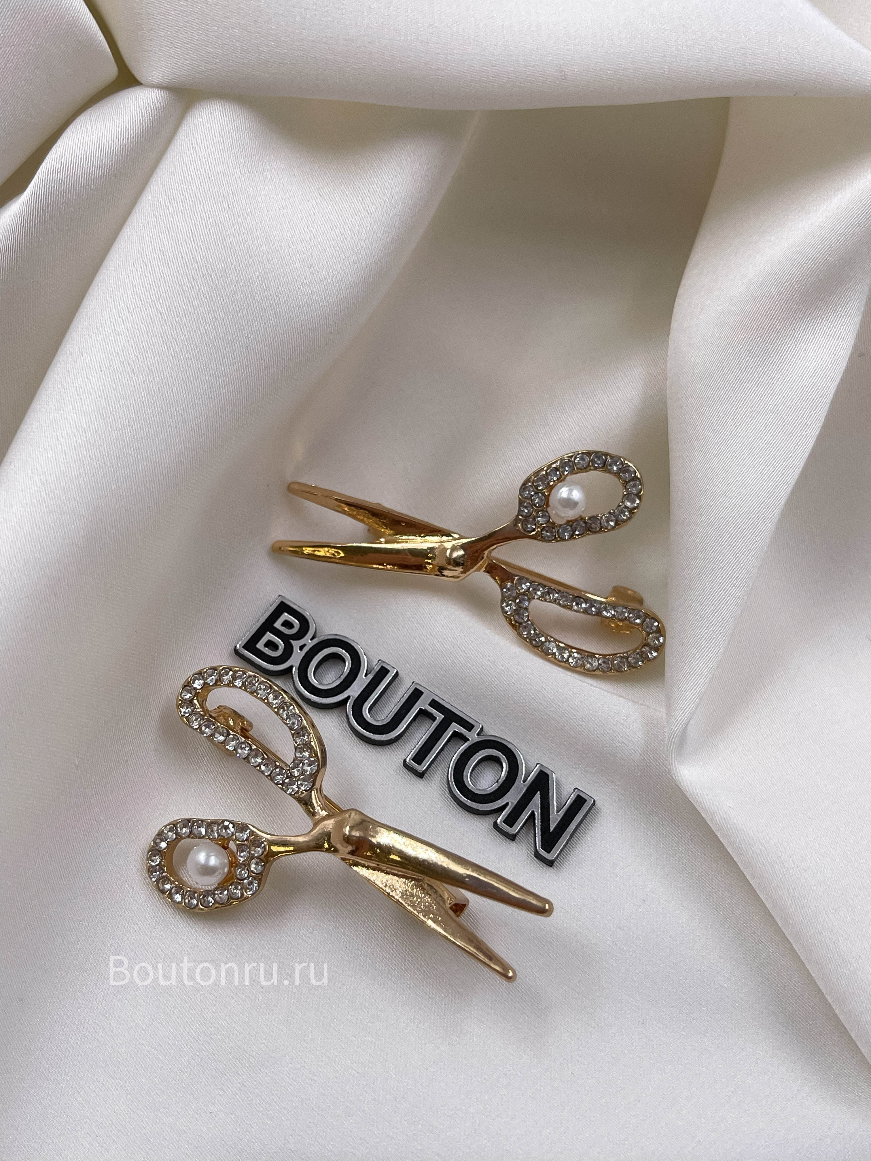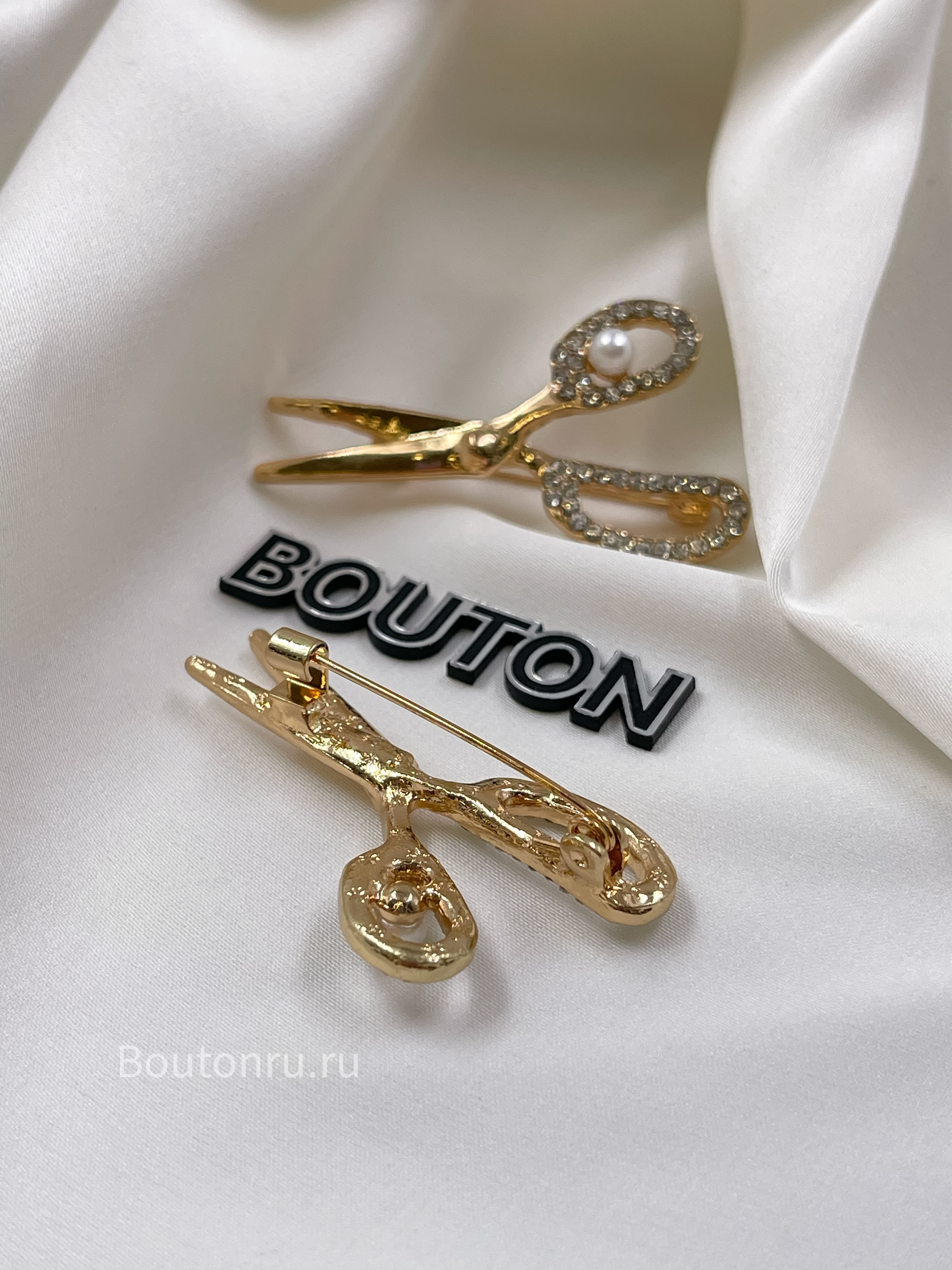 Брошь золотистая "Ножницы " со стразами и жемчугом