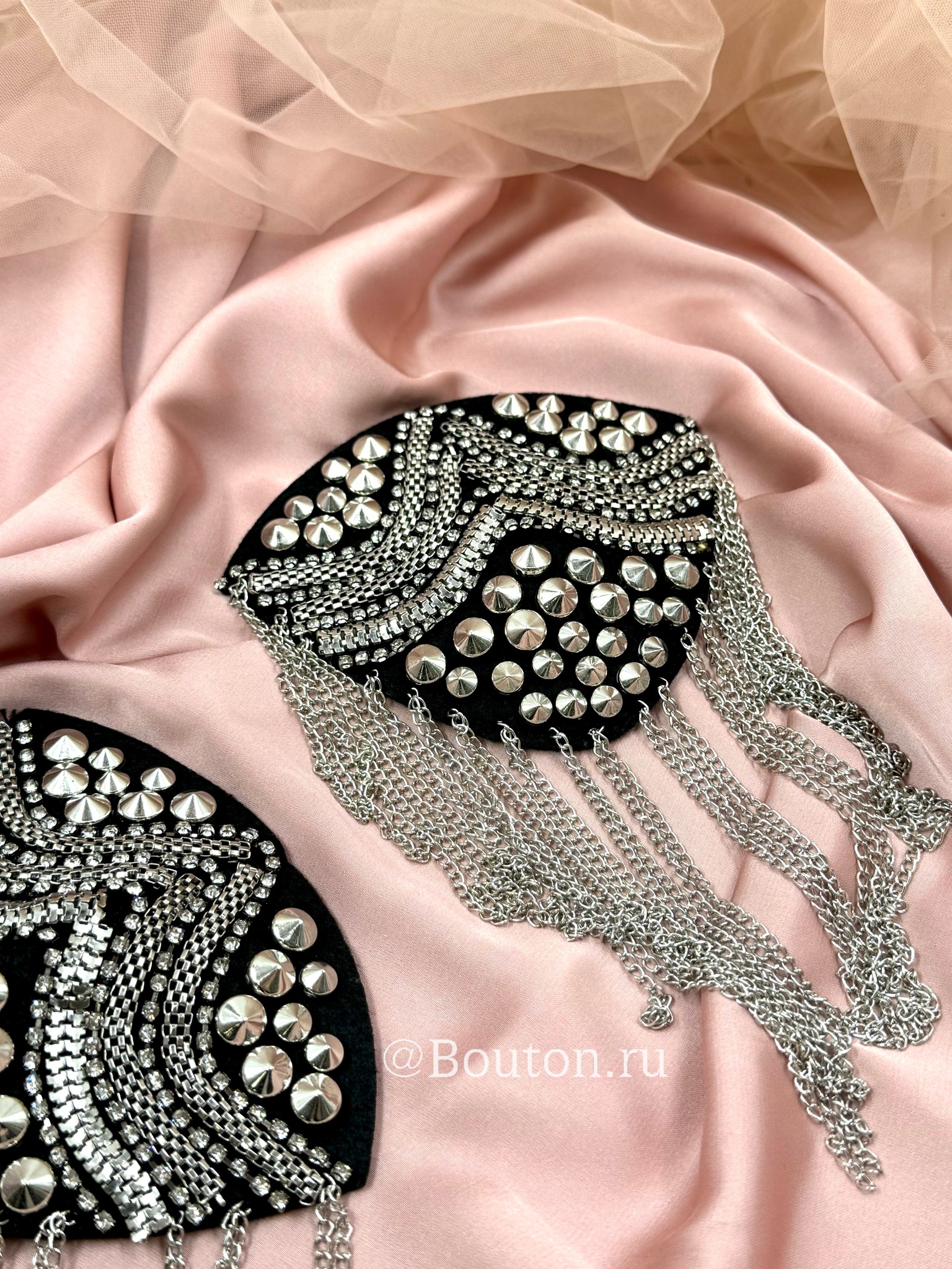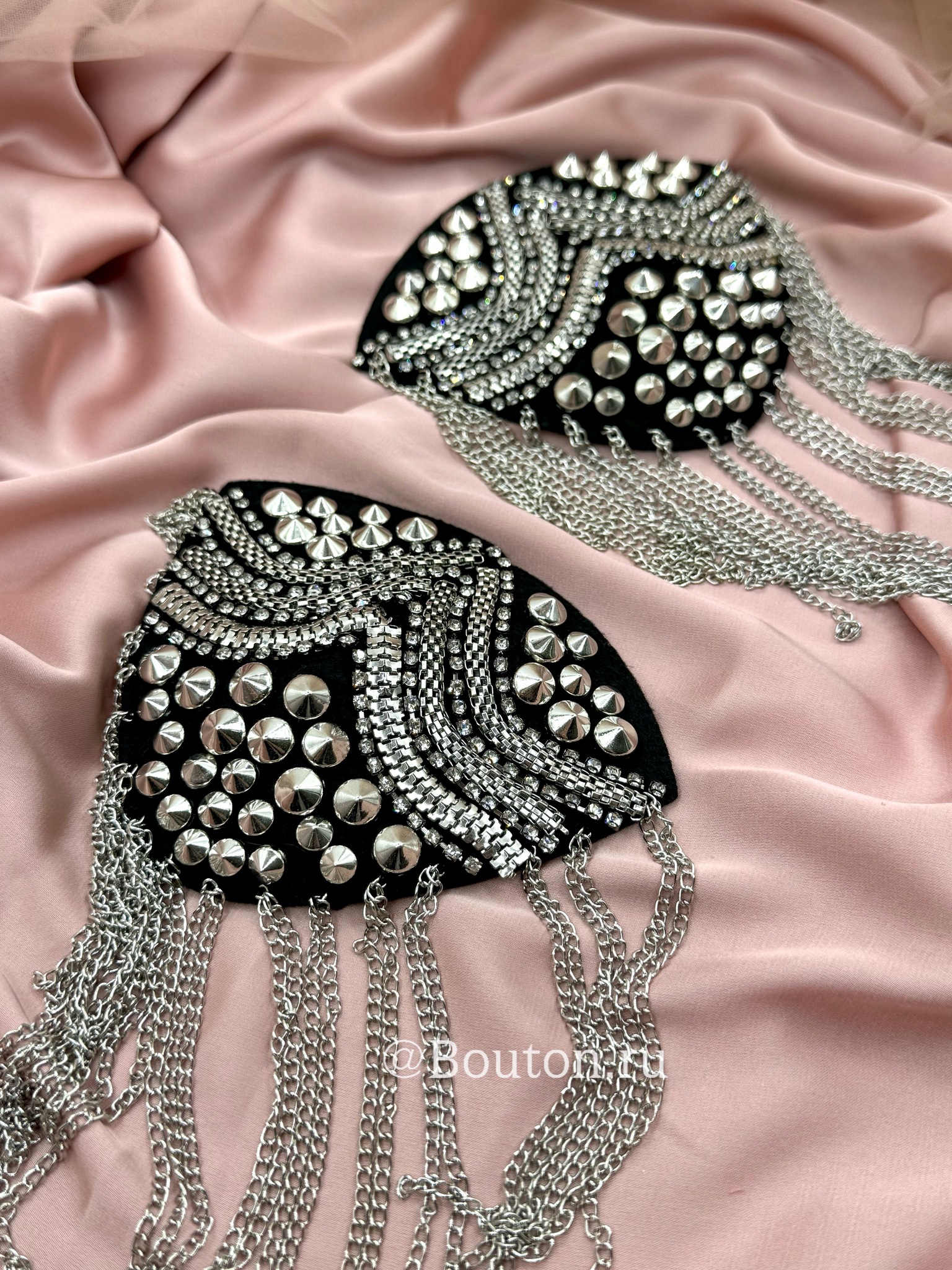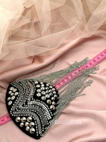 Шикарная съемная брошь-эполет (наплечник) в черном цвете, эполет дополнен стразами , шипами и фактурными серебристыми цепями . Эполеты – это оригинальный элемент декорирования одежды, который способен дополнить ваш стиль и придать ему дополнительный шарм. Это настоящее украшение для форменной одежды, которое привнесет в образ элегантность и изысканность.