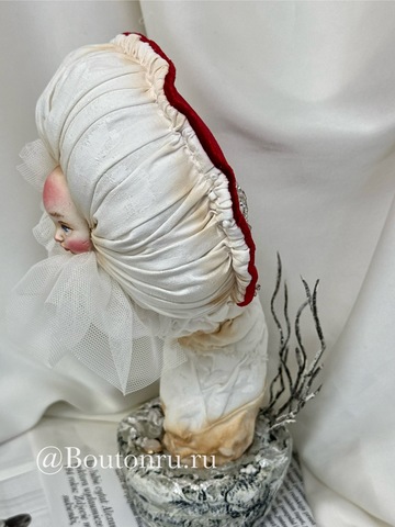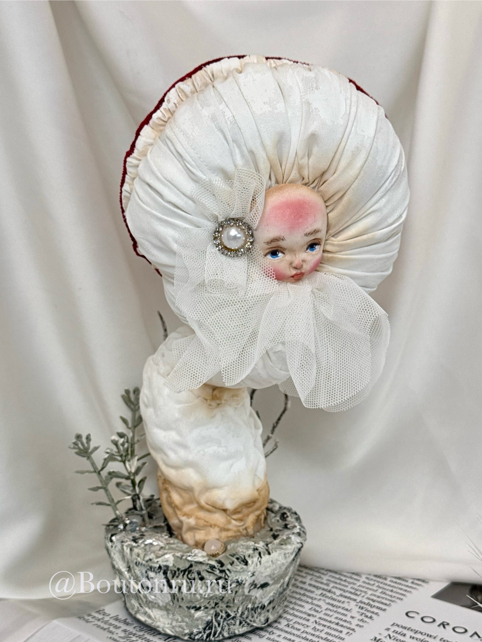 Авторская игольница ручной работы в форме фантазийного гриба — это не просто аксессуар для рукоделия, а настоящее декоративное произведение искусства. Верхушка гриба украшена изящной кукольной головкой с нежной росписью и выразительным взглядом, обрамлённой мягкой текстильной «шляпкой» и воздушным тюлем.