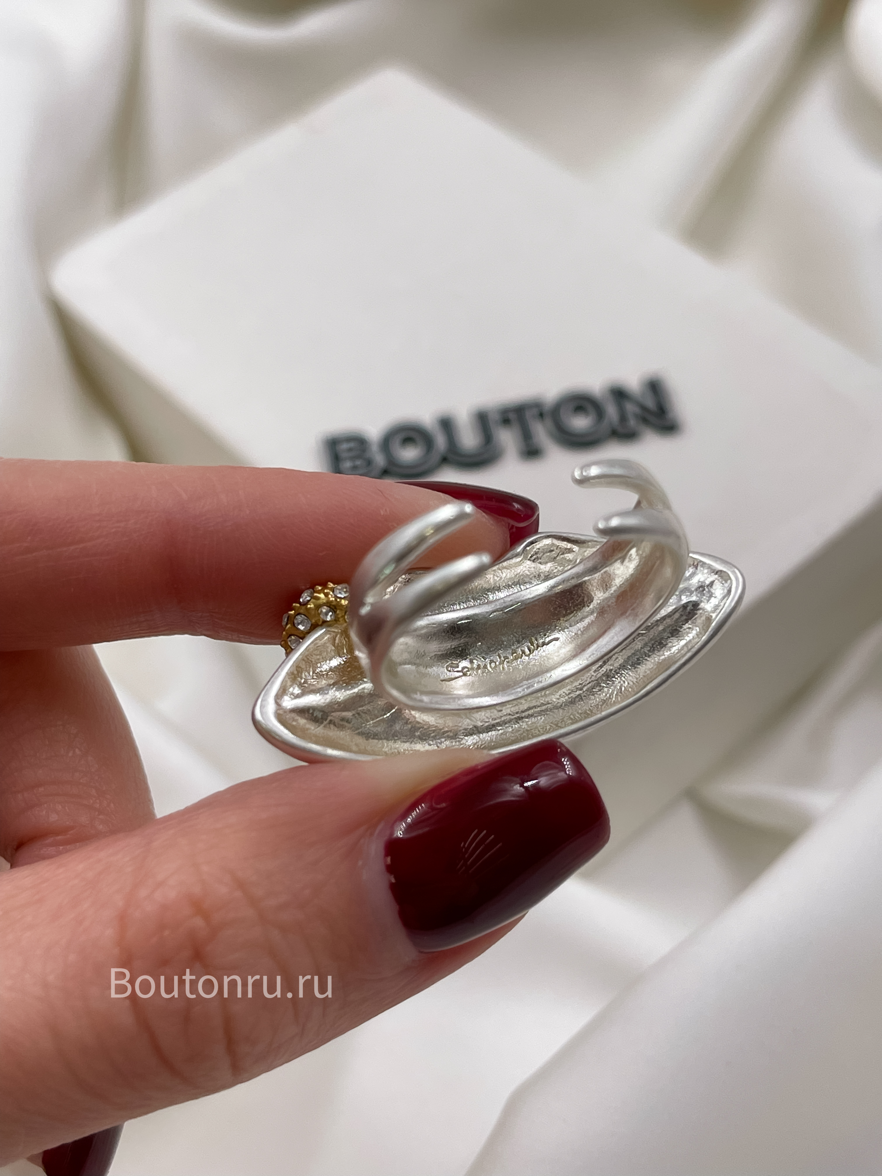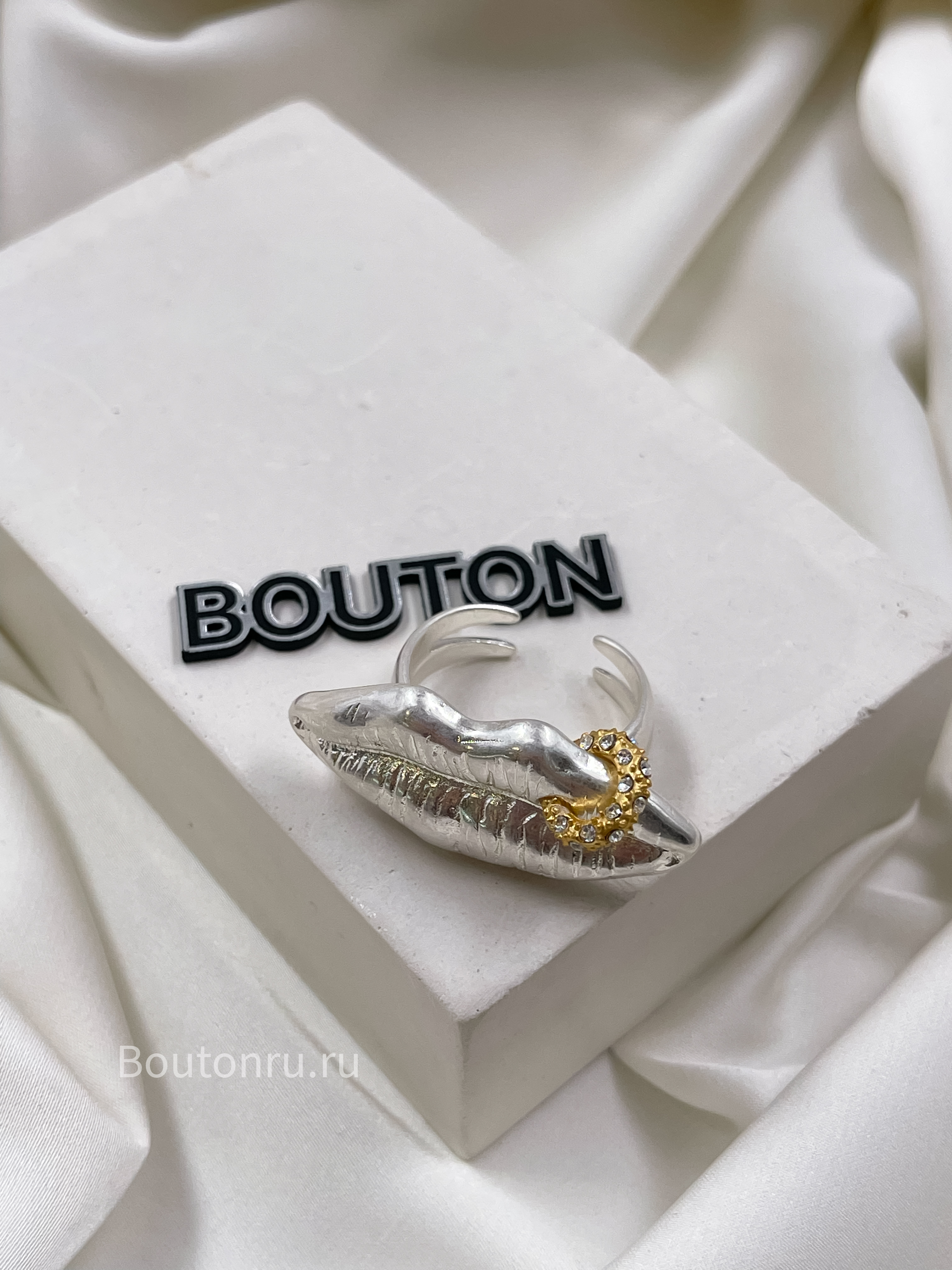 Кольцо Скиап. серебристое в форме "Губ" с золотистым пирсингом в стразах