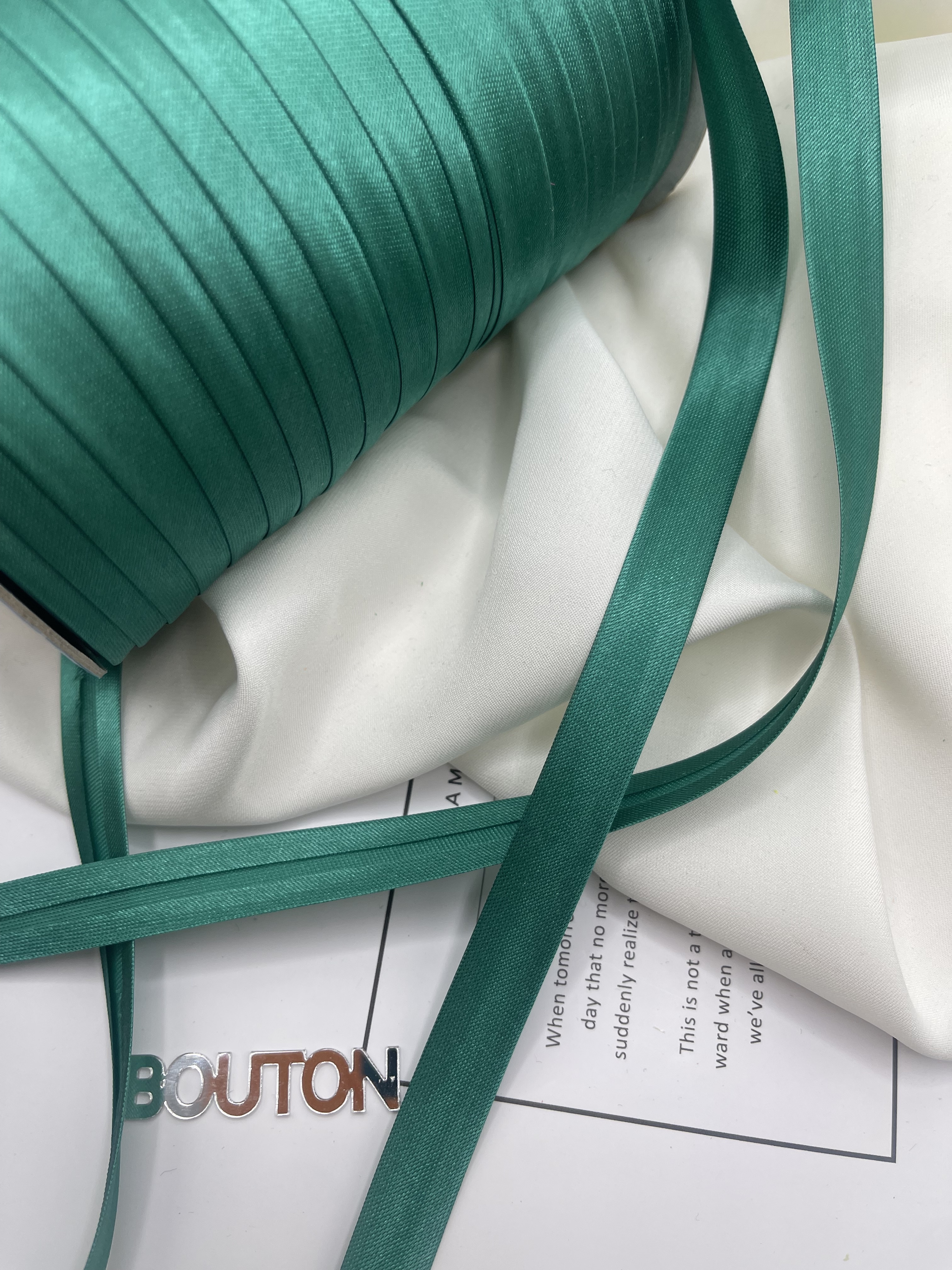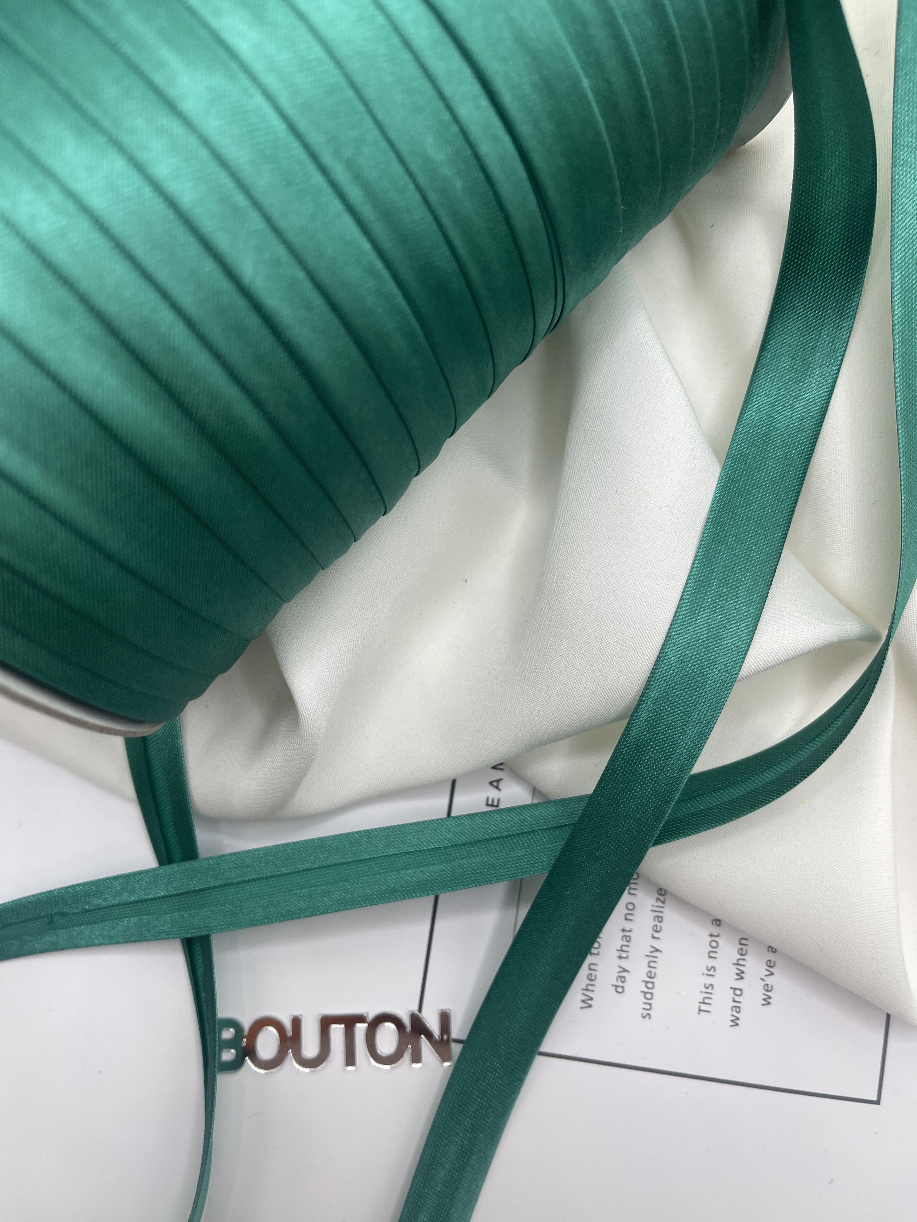 Полиэстеровая тесьма, выкроенная по косой, с заранее подогнутыми припусками. Она достаточно мягкая, легко укладывается на неровные срезы без складок и без смещения, образуя ровный красивый борт. Применяется для обработки срезов бортов, для горловины, при шитье рукава одежды. Также ее применяют при изготовлении мебели, отделки предметов интерьера включая шторы.