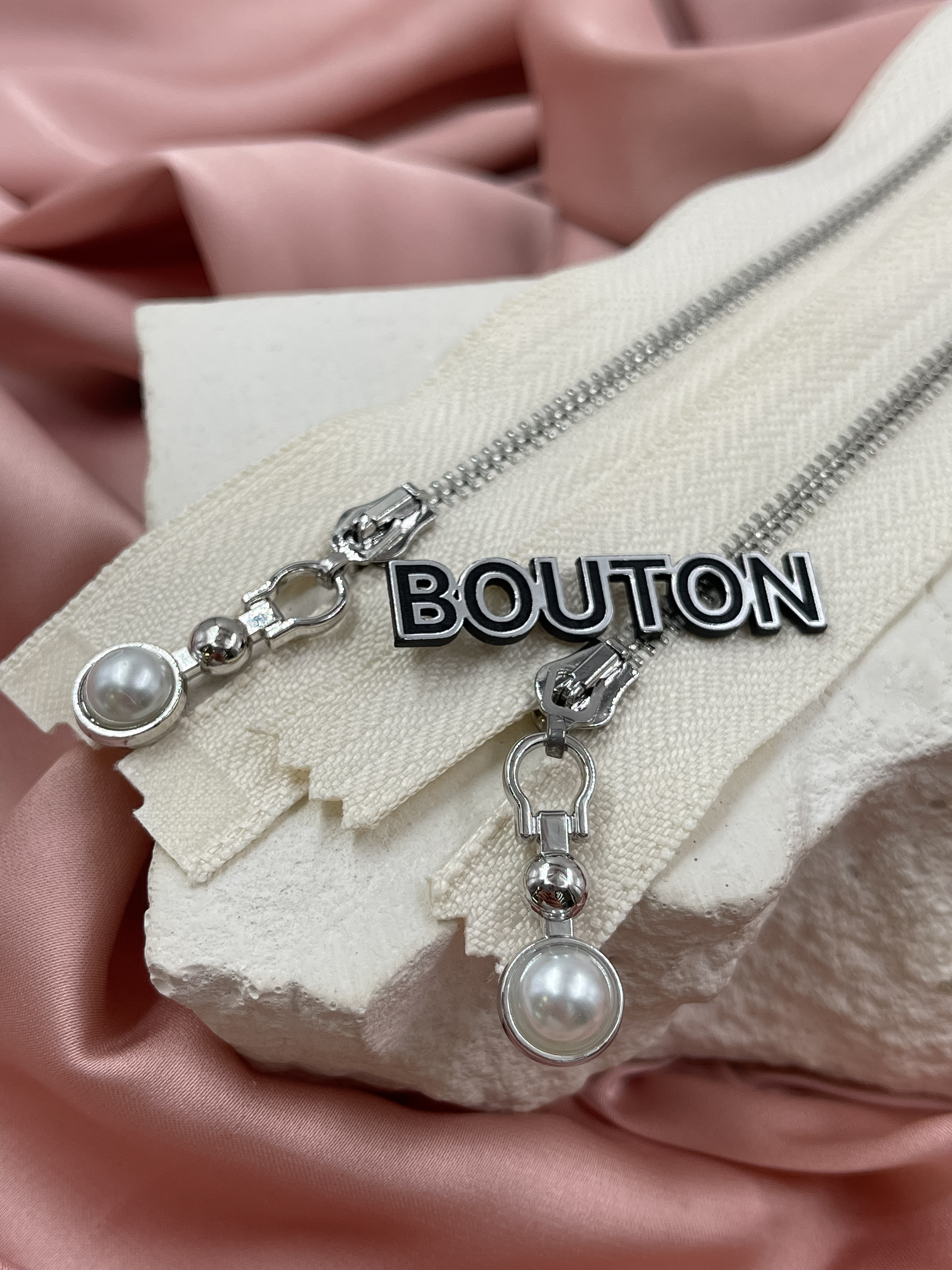 Молния бежевая (молочная) серебро с бегунком жемчужиной