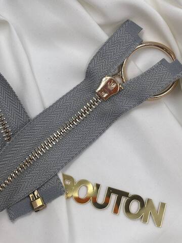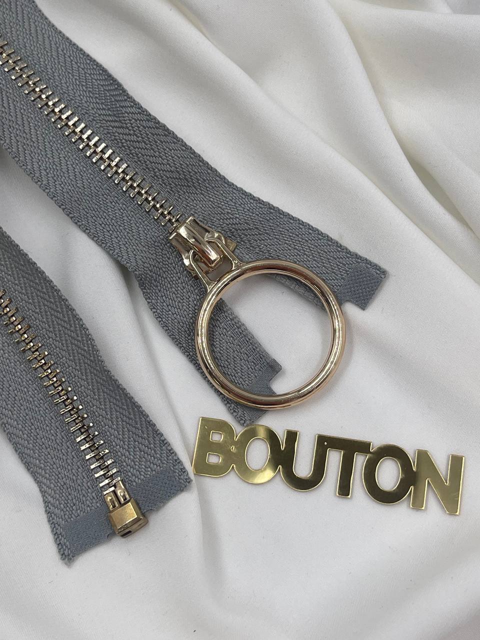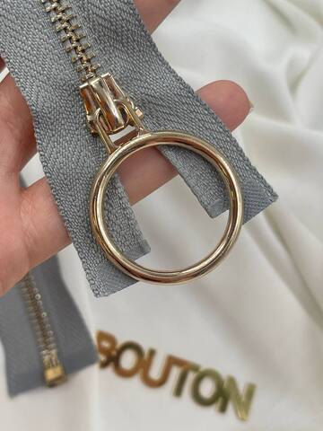 Молния серого цвета с золотистой фурнитурой и бегунком в форме массивного кольца