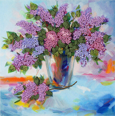 В набор входит: ткань-габардин с напечатанным рисунком, хлопчатобумажные нитки мулине и шелковые ленты на держателе, иглы для вышивания мулине и лентами с широким ушком, а также подробная пошаговая инструкция с цветными фотографиями. Изделия комплектуются материалами бренда "Gamma", известного своим качеством.