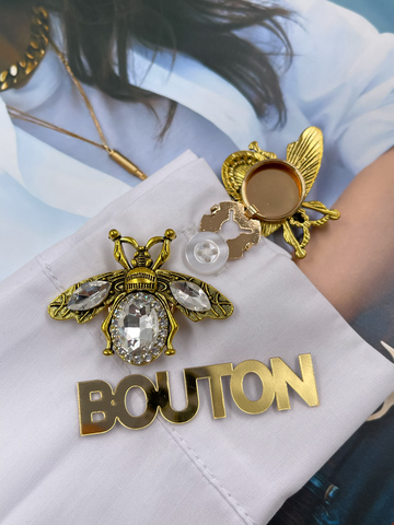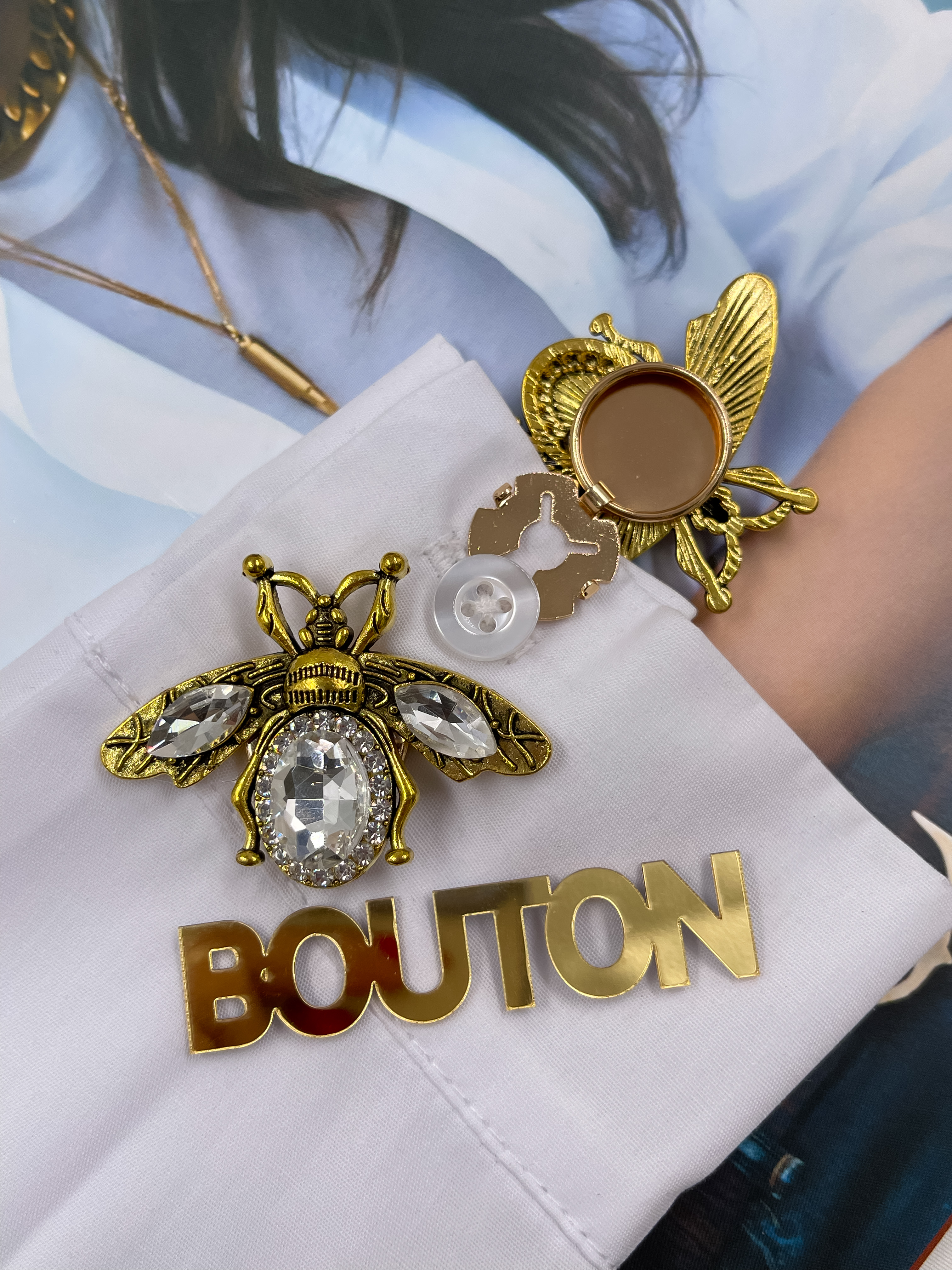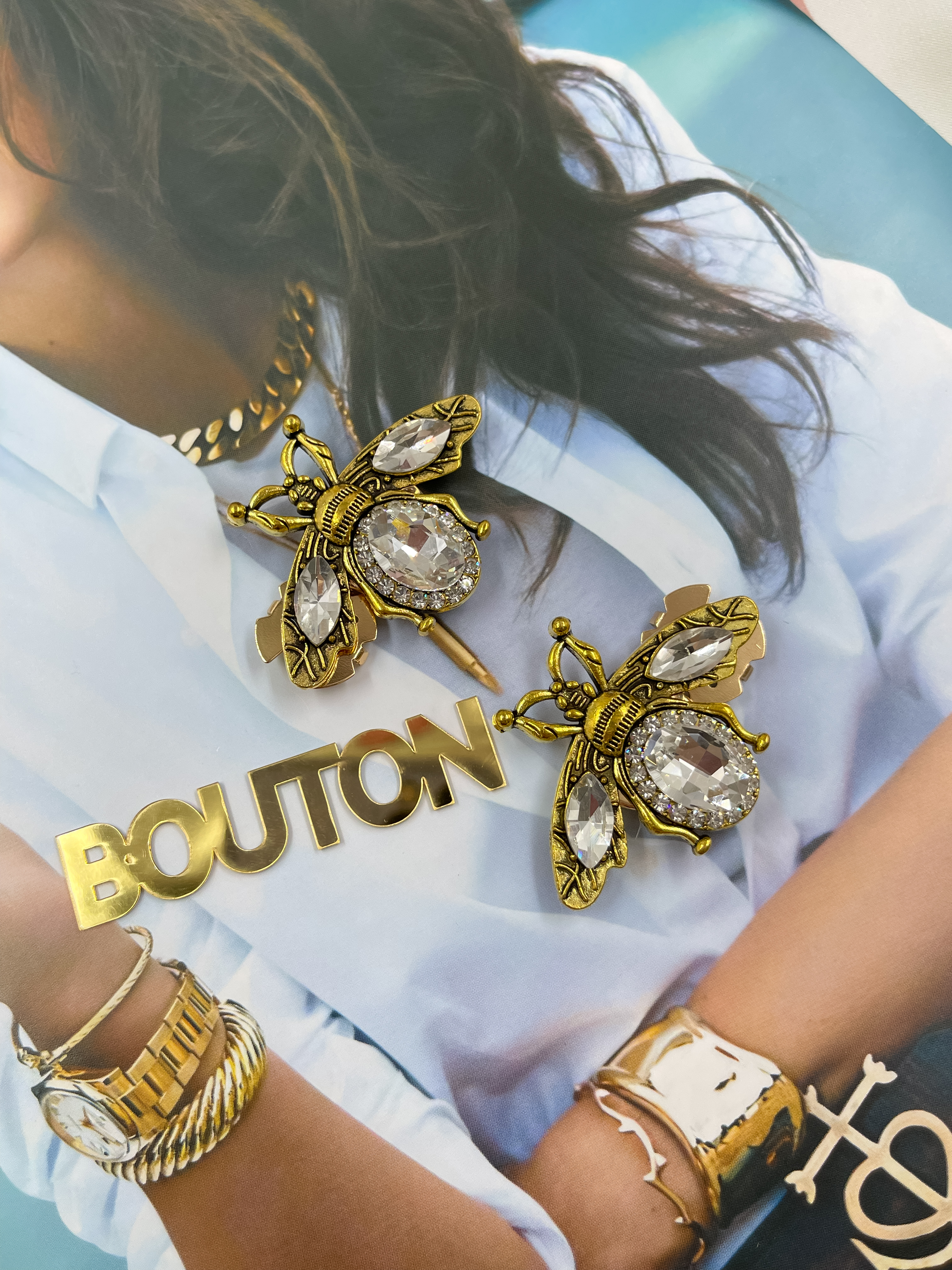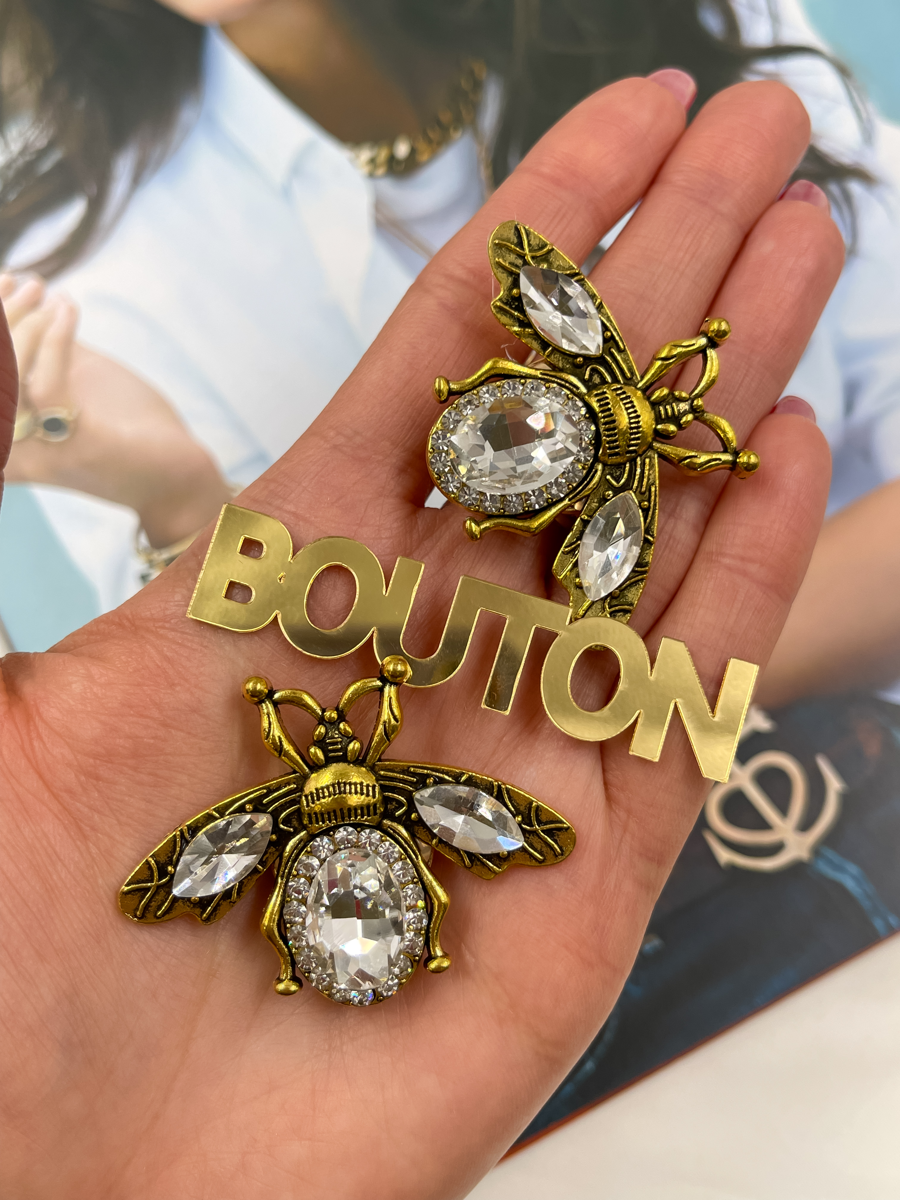 Накладка на пуговицу золотистая бронза "Жук" с прозрачными стразами
