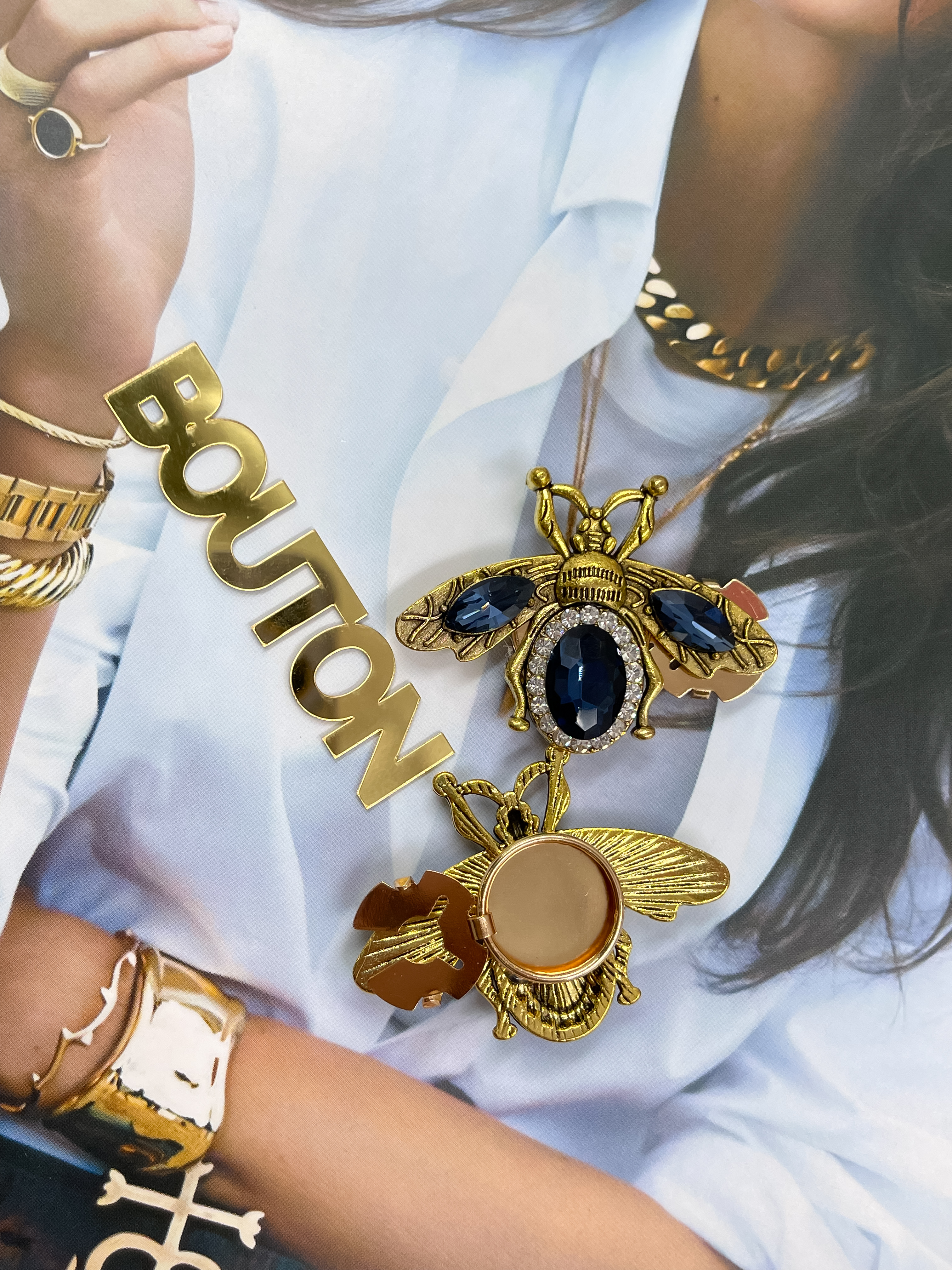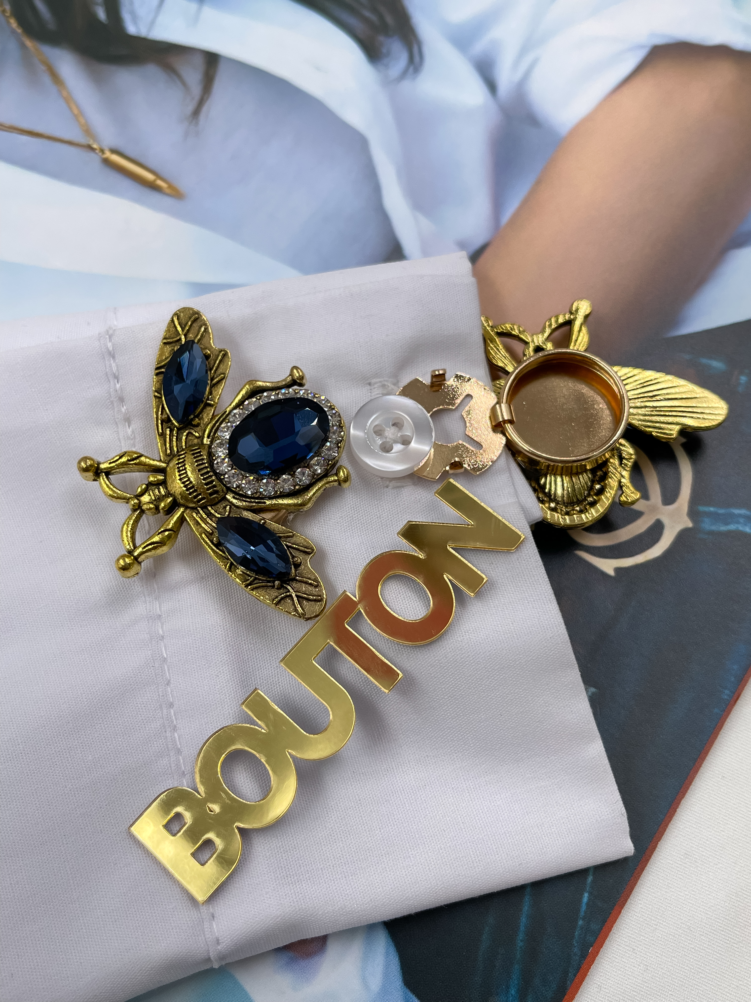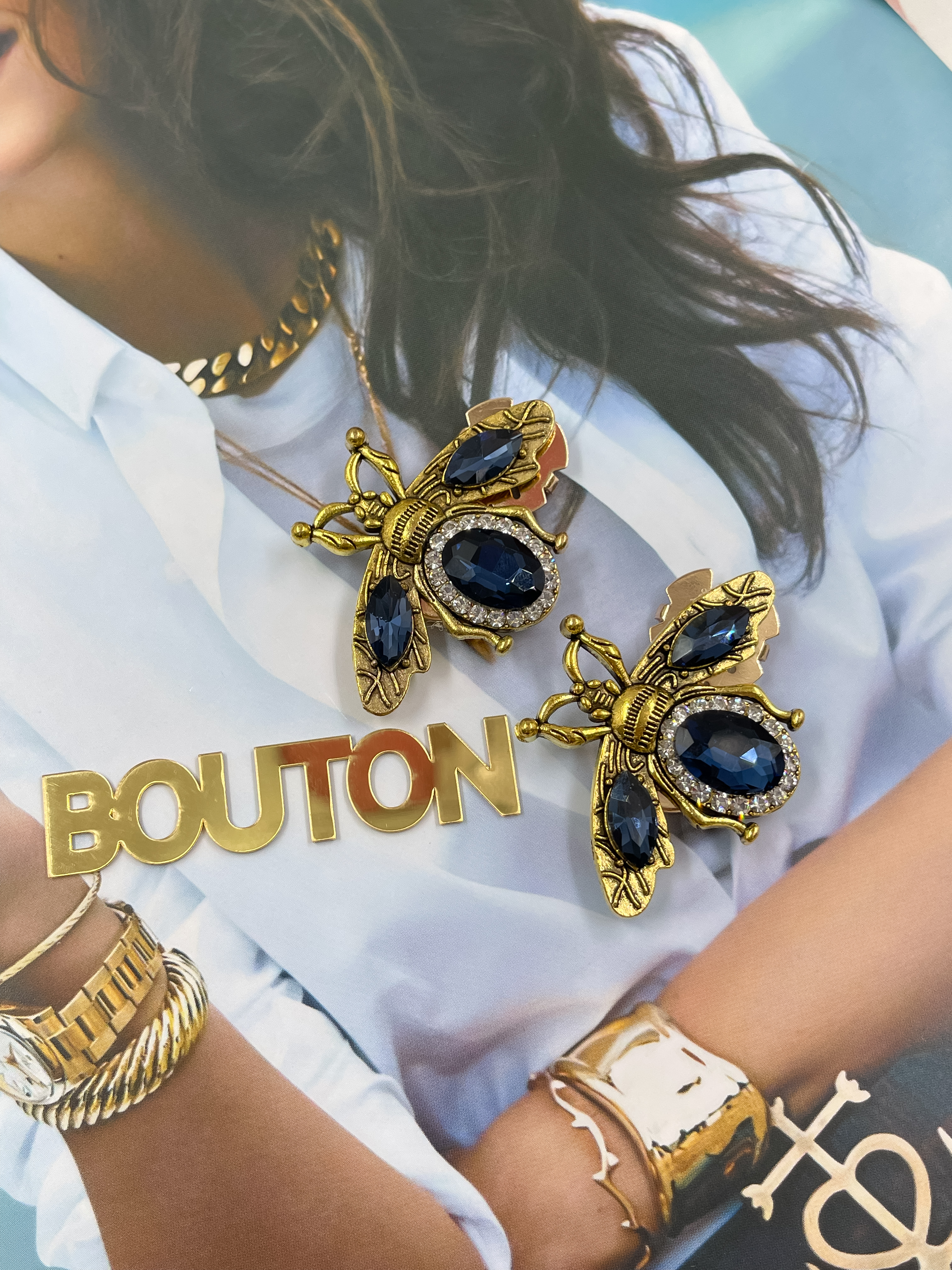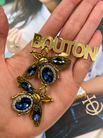 Накладка на пуговицу золотистая бронза "Жук" с синими стразами