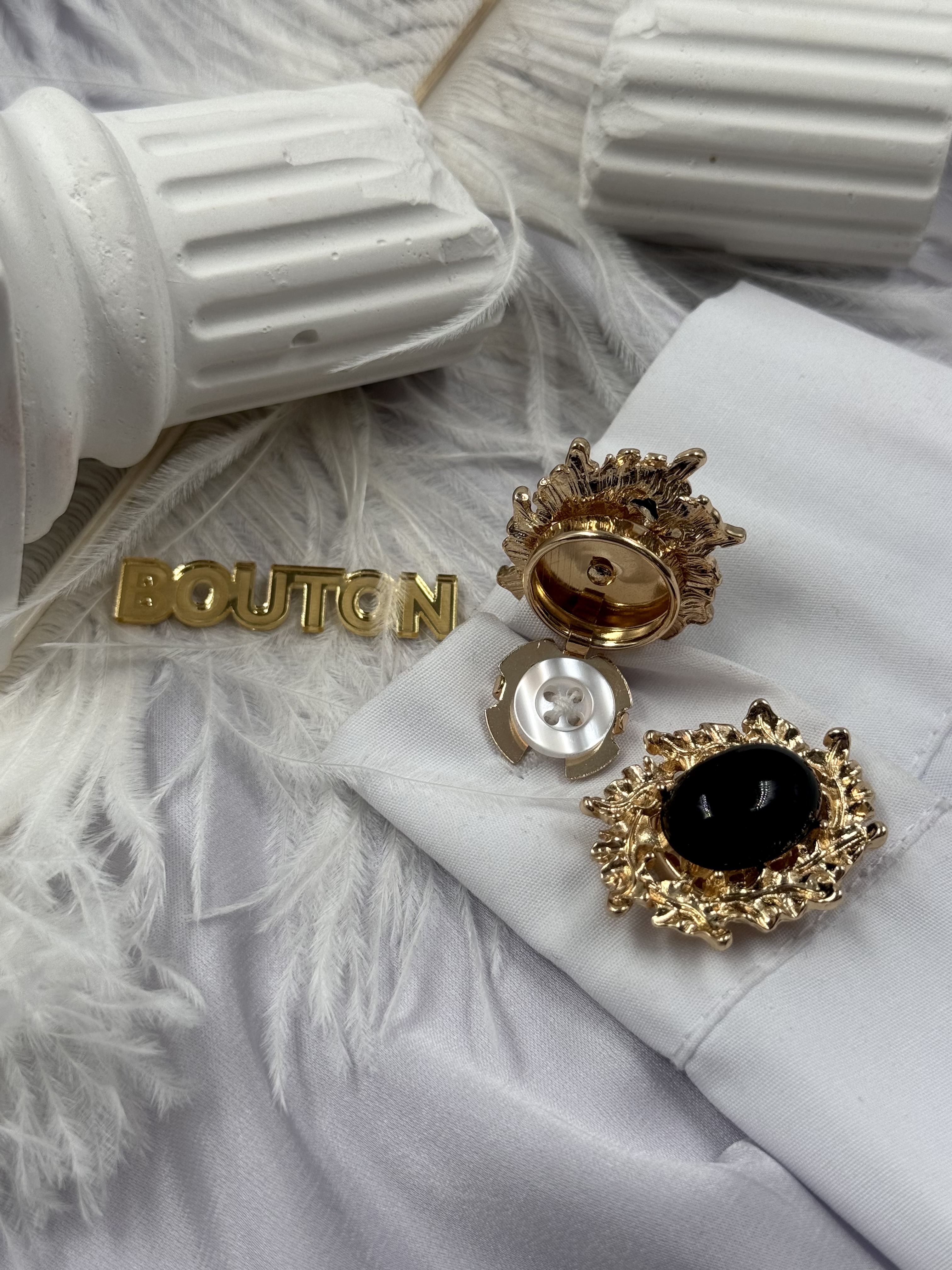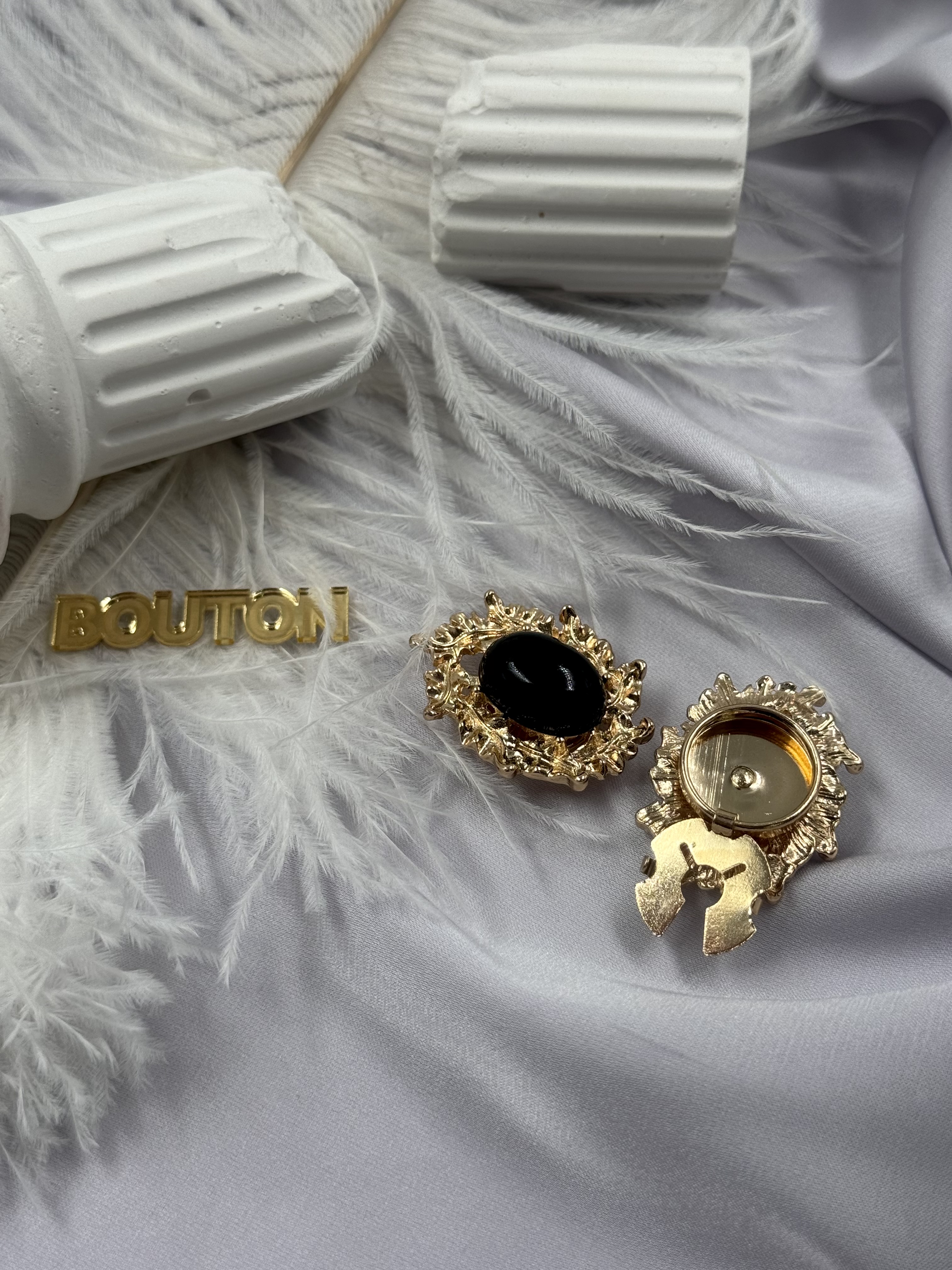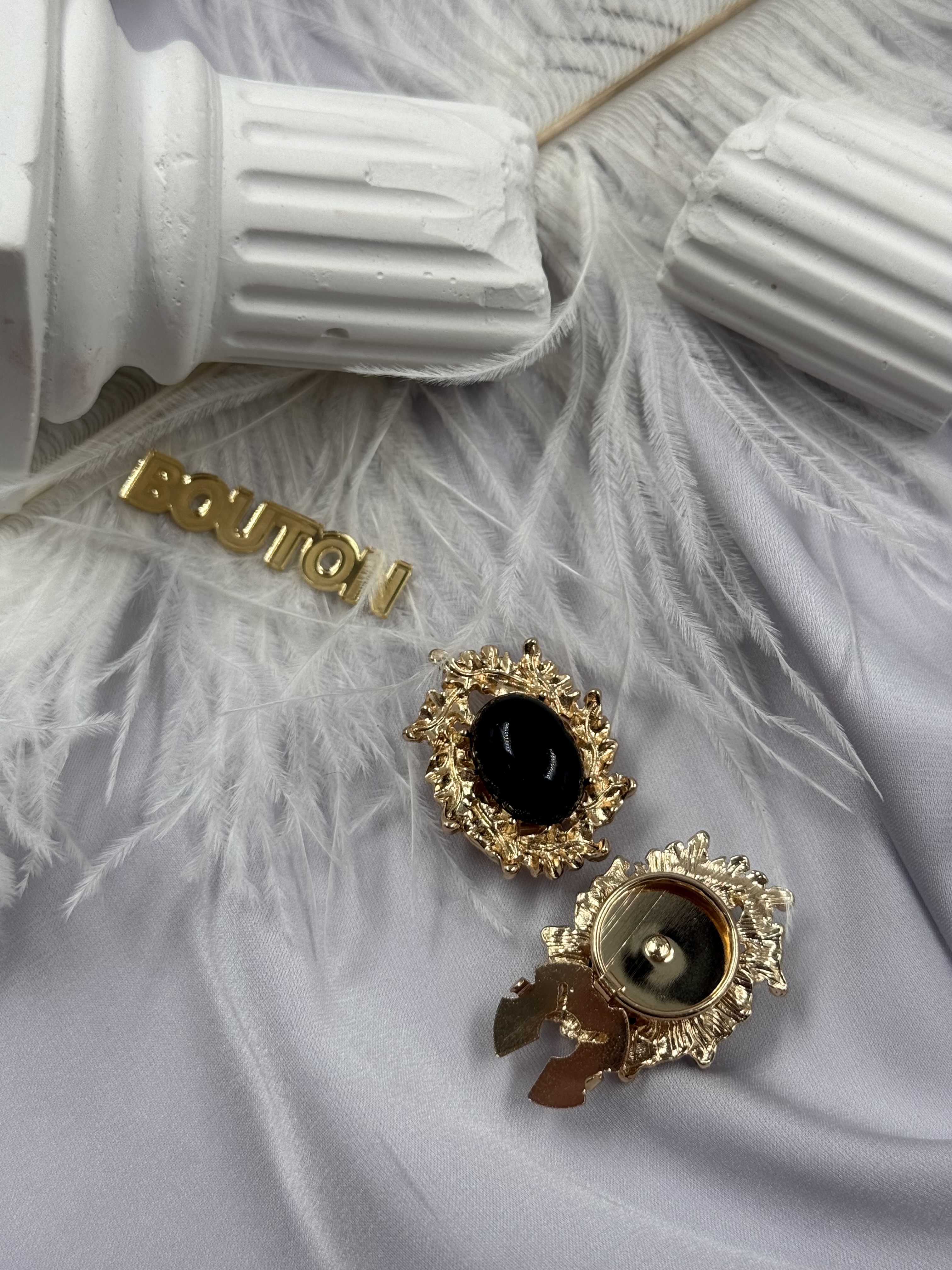 Накладка на пуговицу золотистая с ажурным (неровным) краем и черным камнем