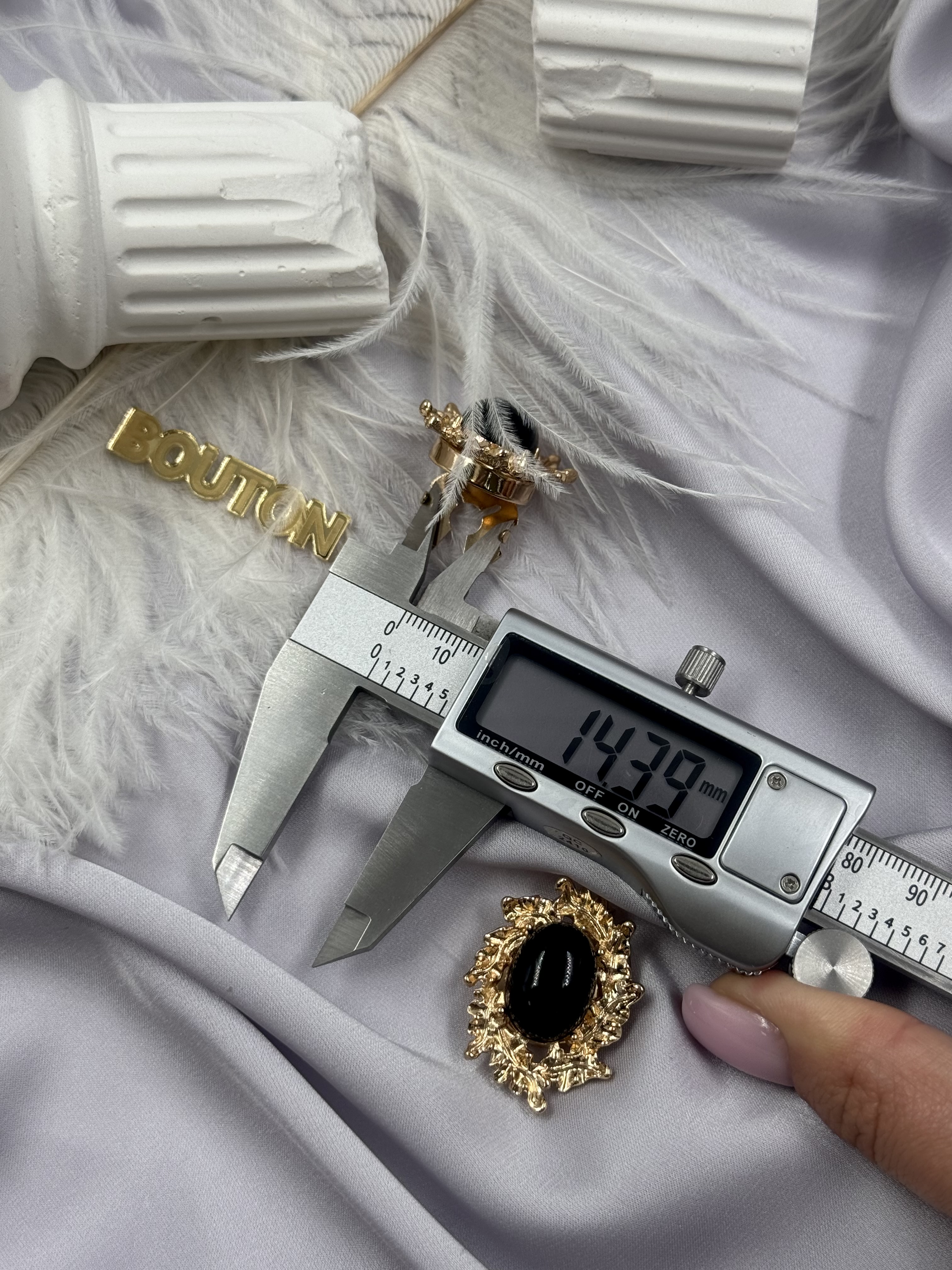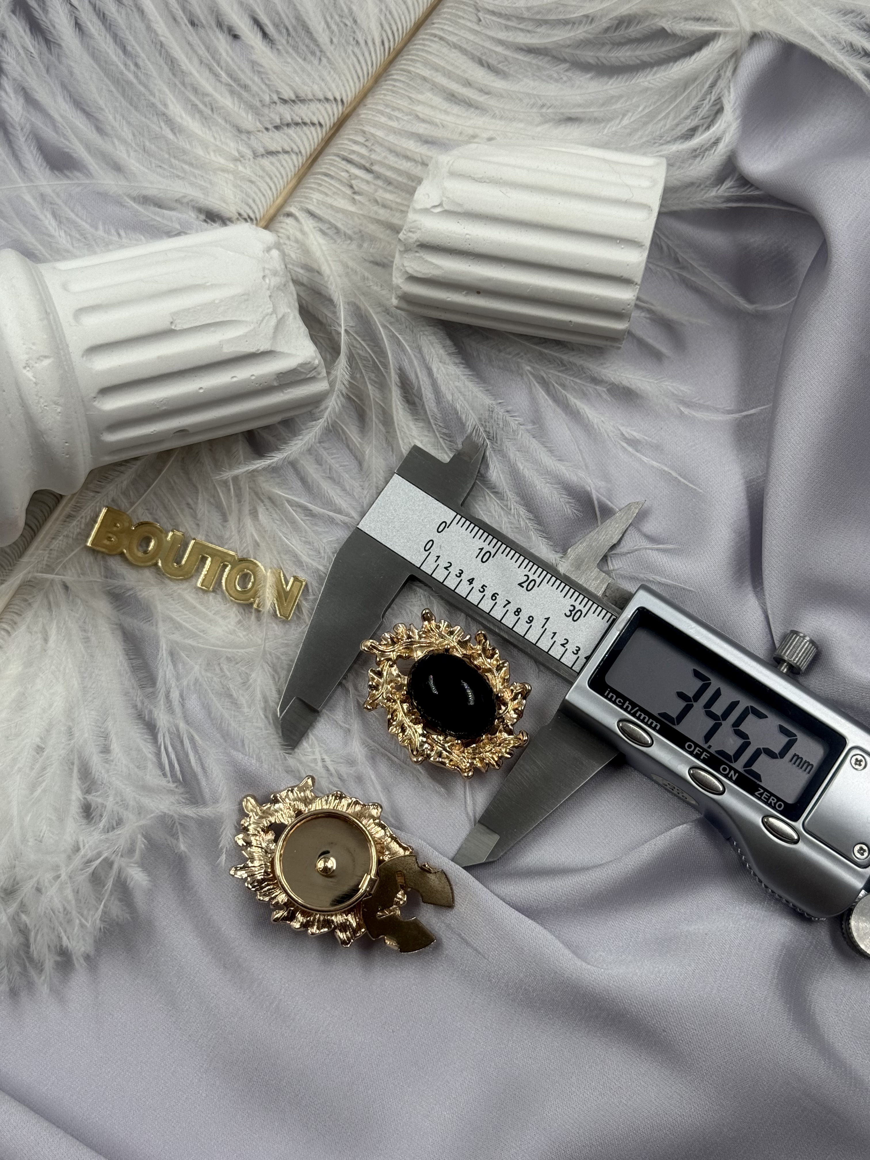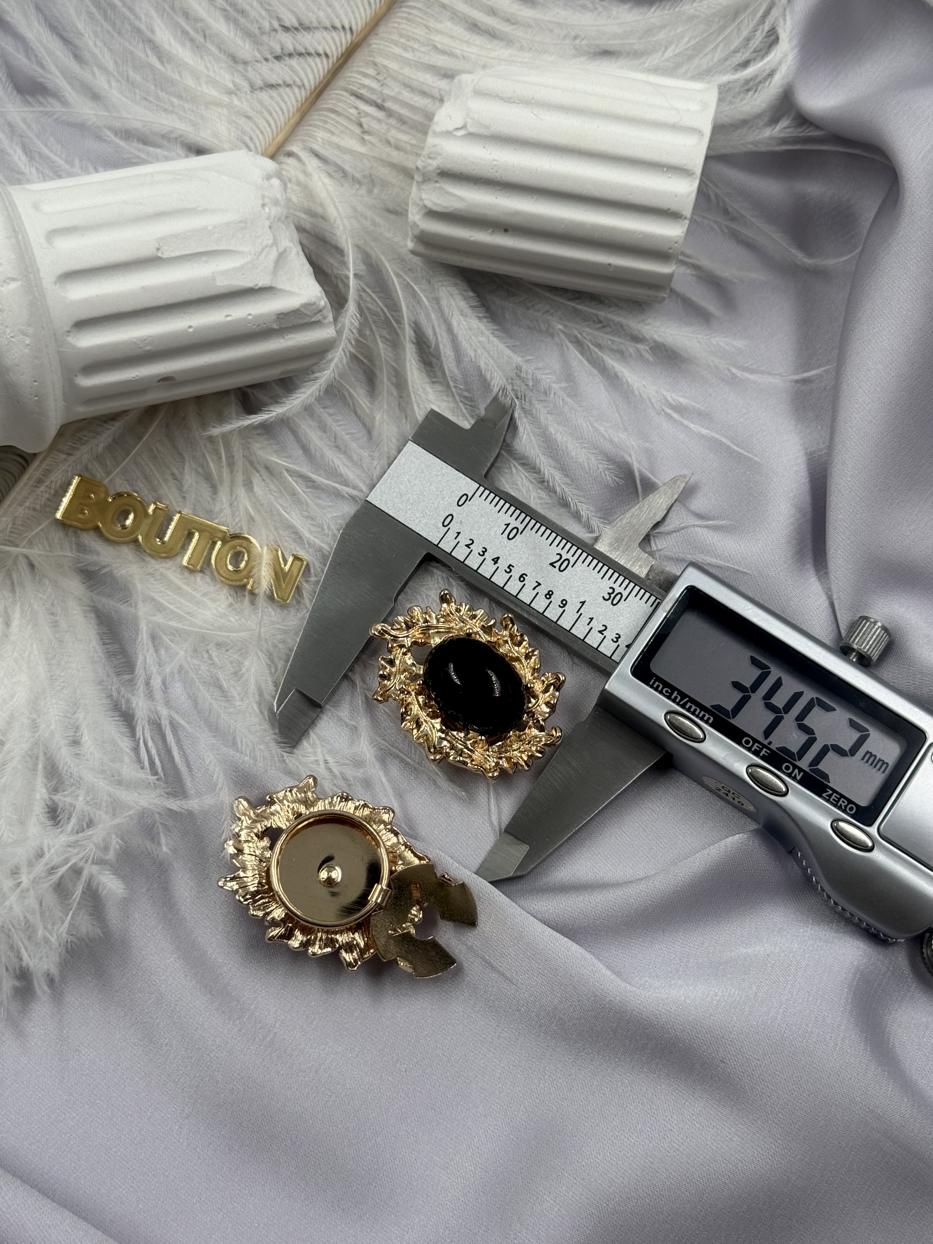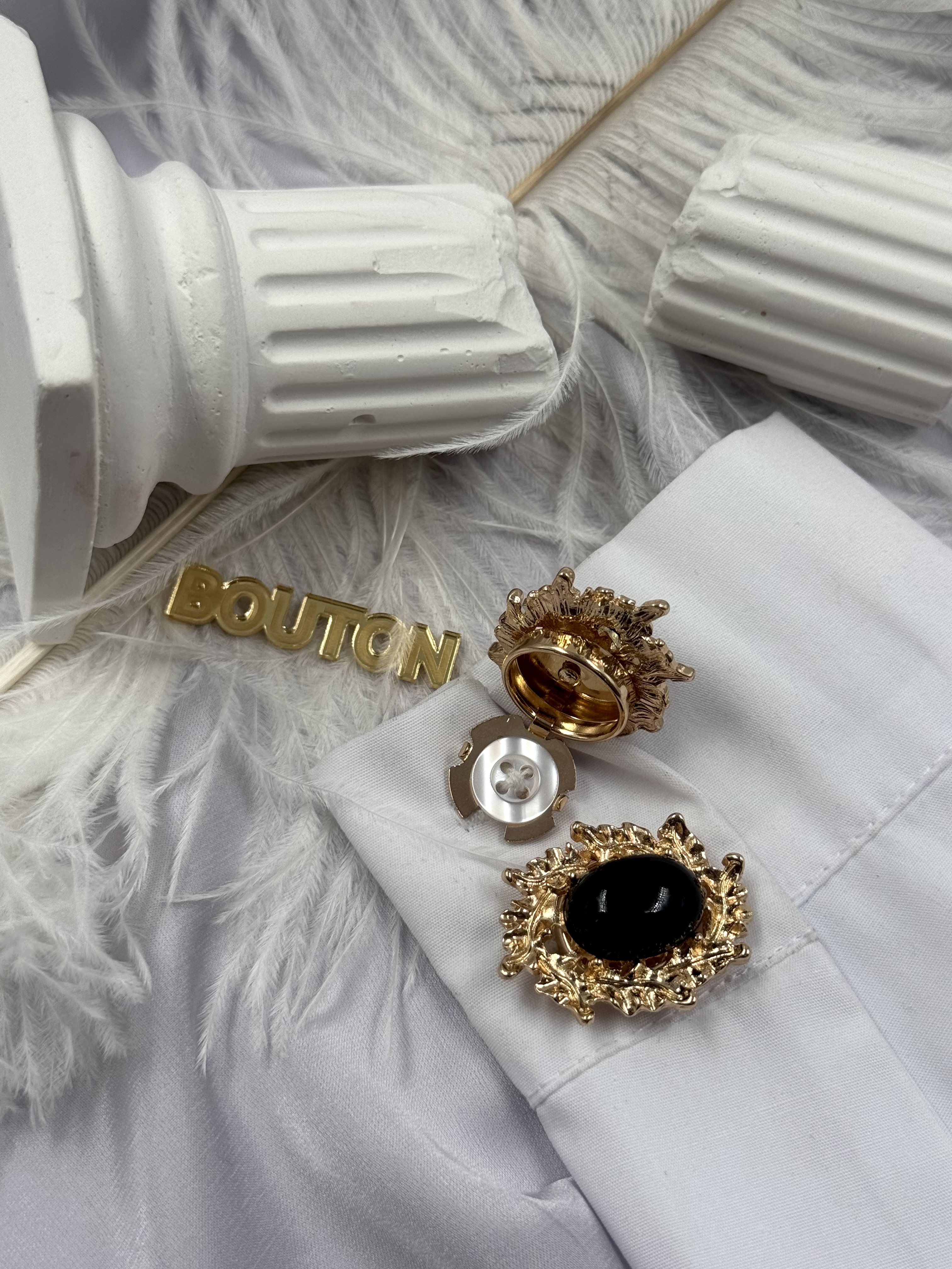 Накладка на пуговицу золотистая с ажурным (неровным) краем и черным камнем
