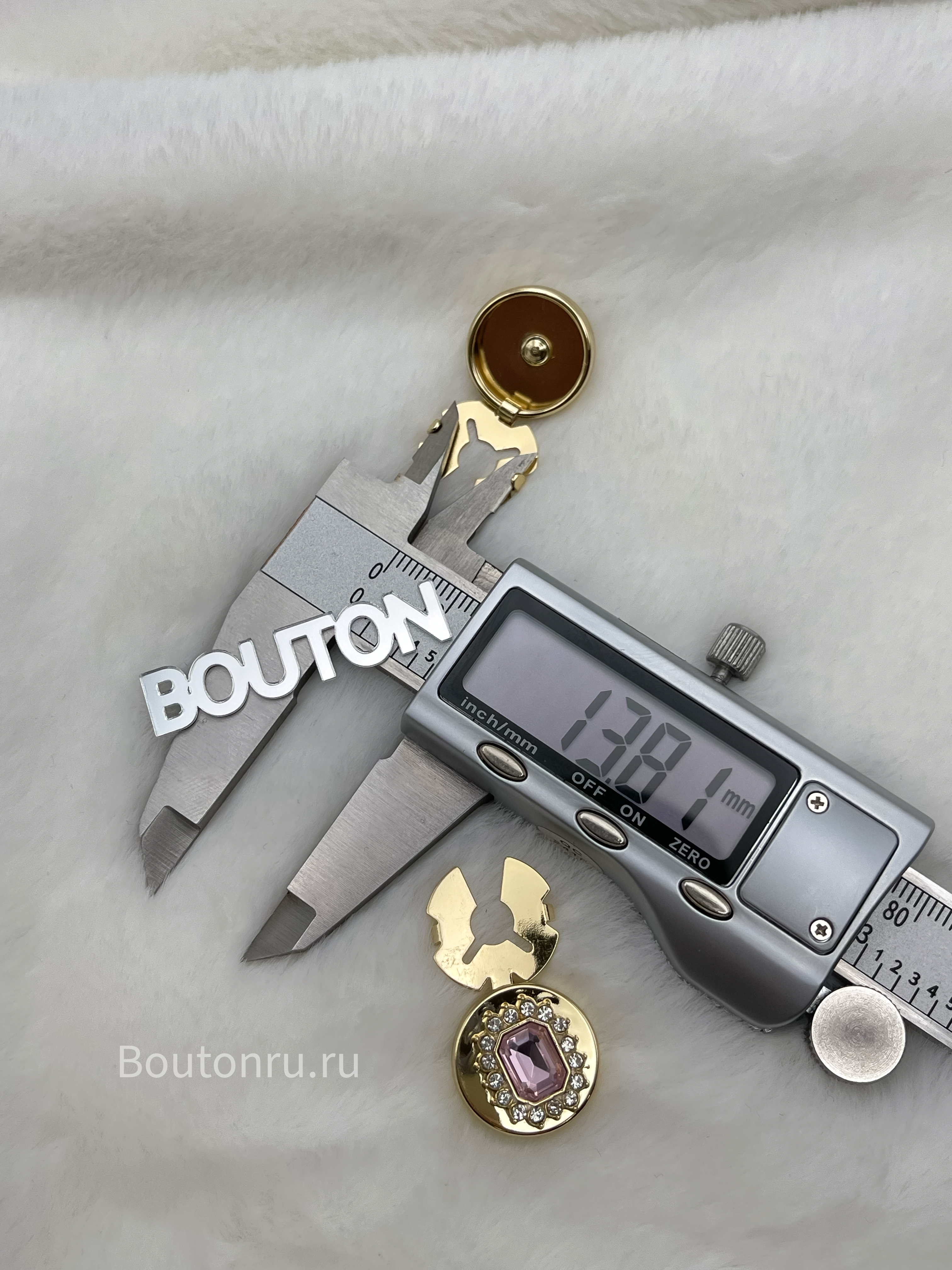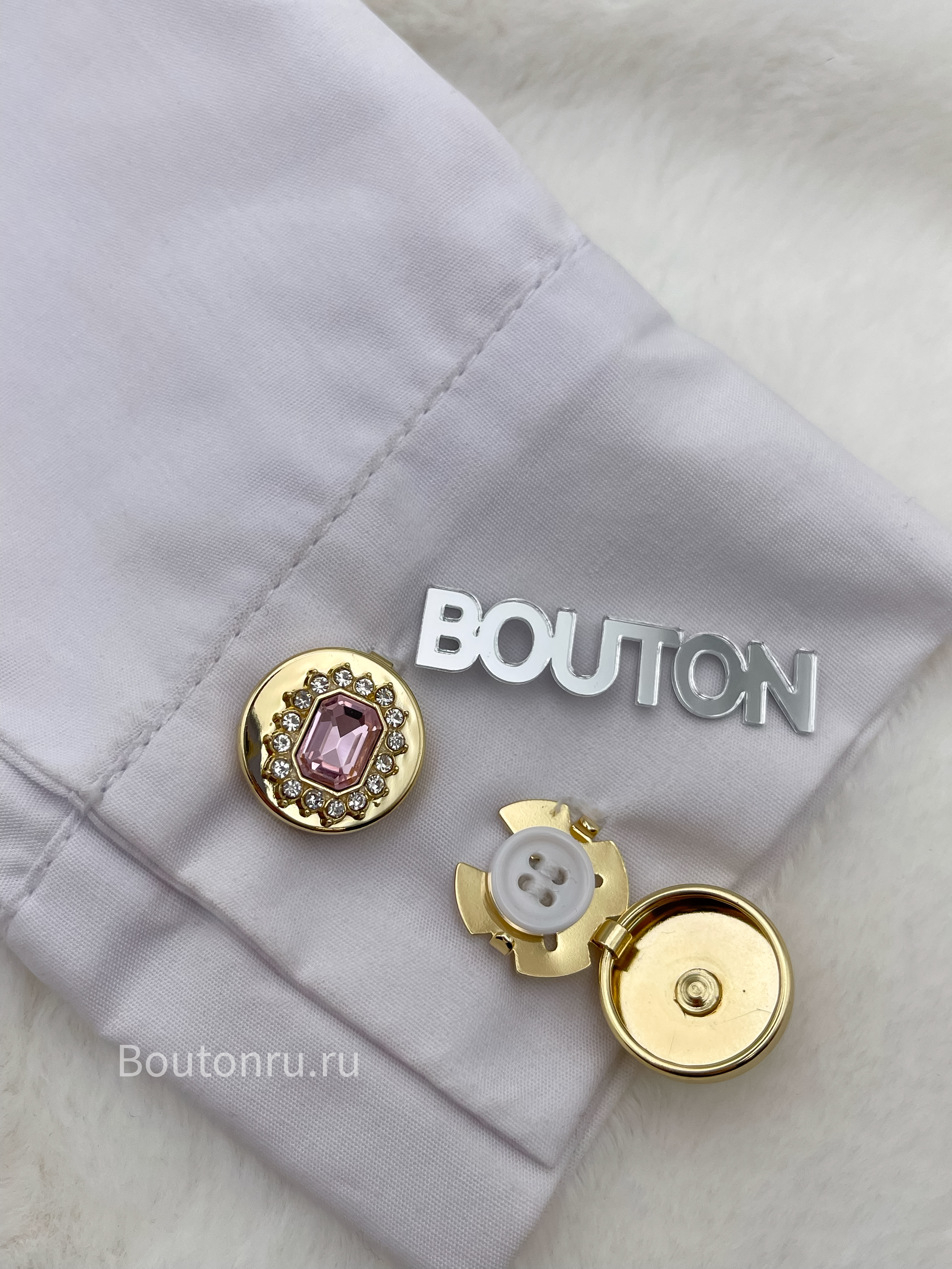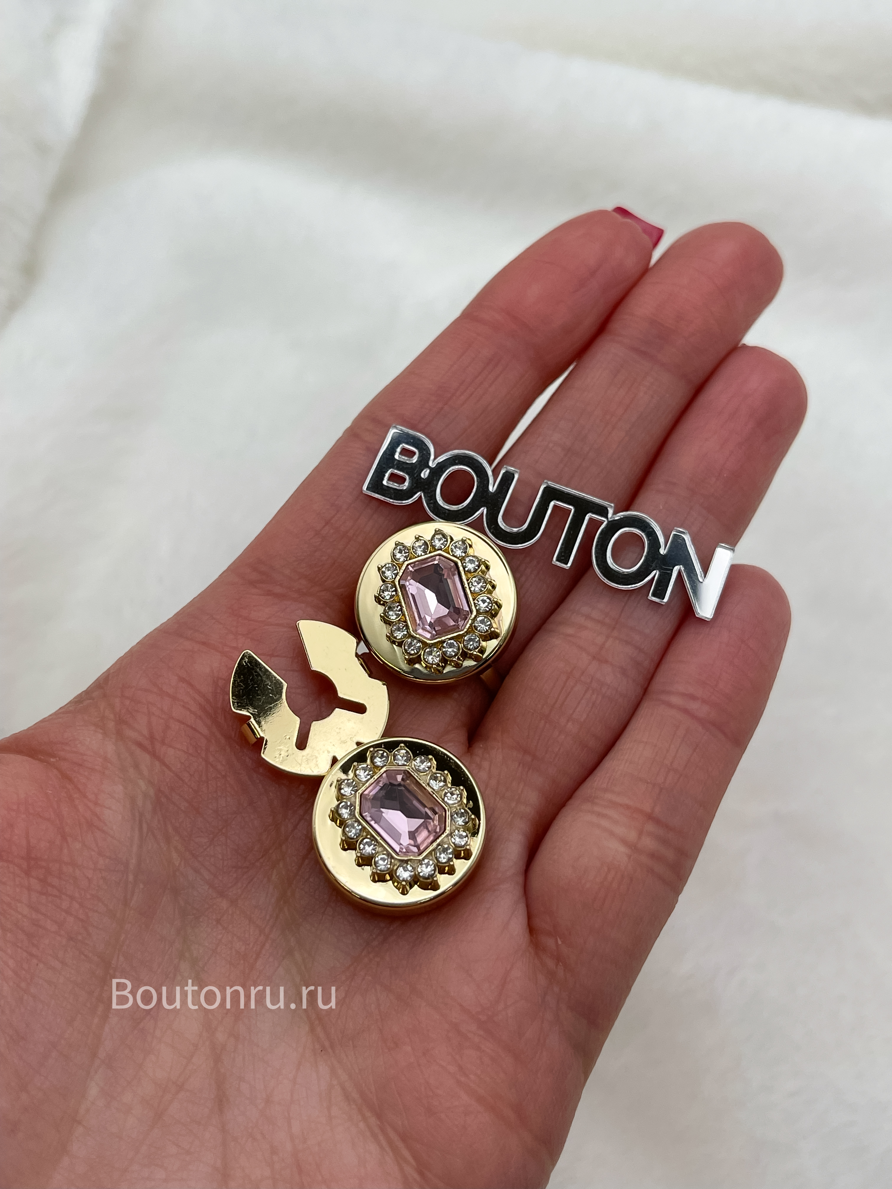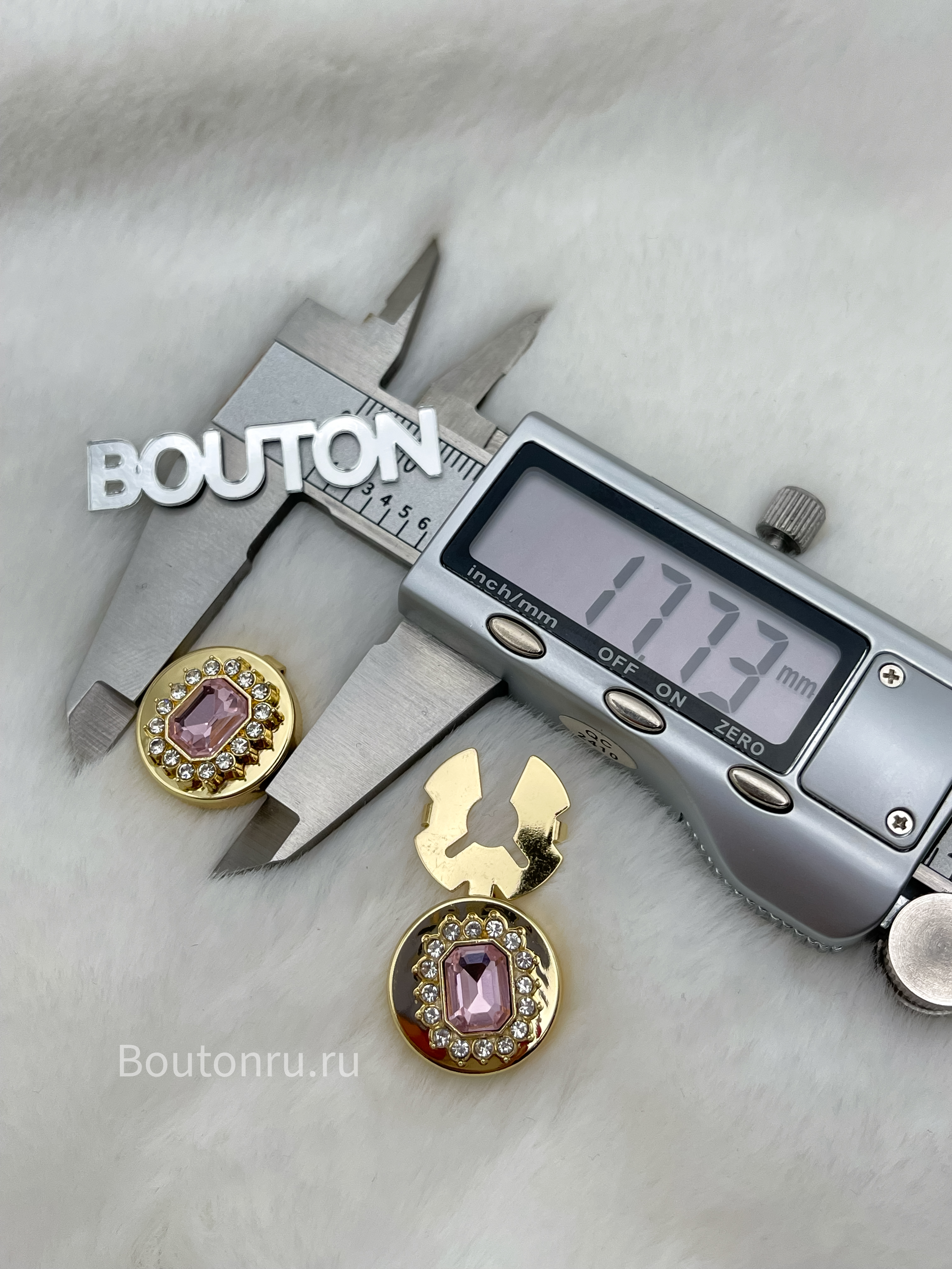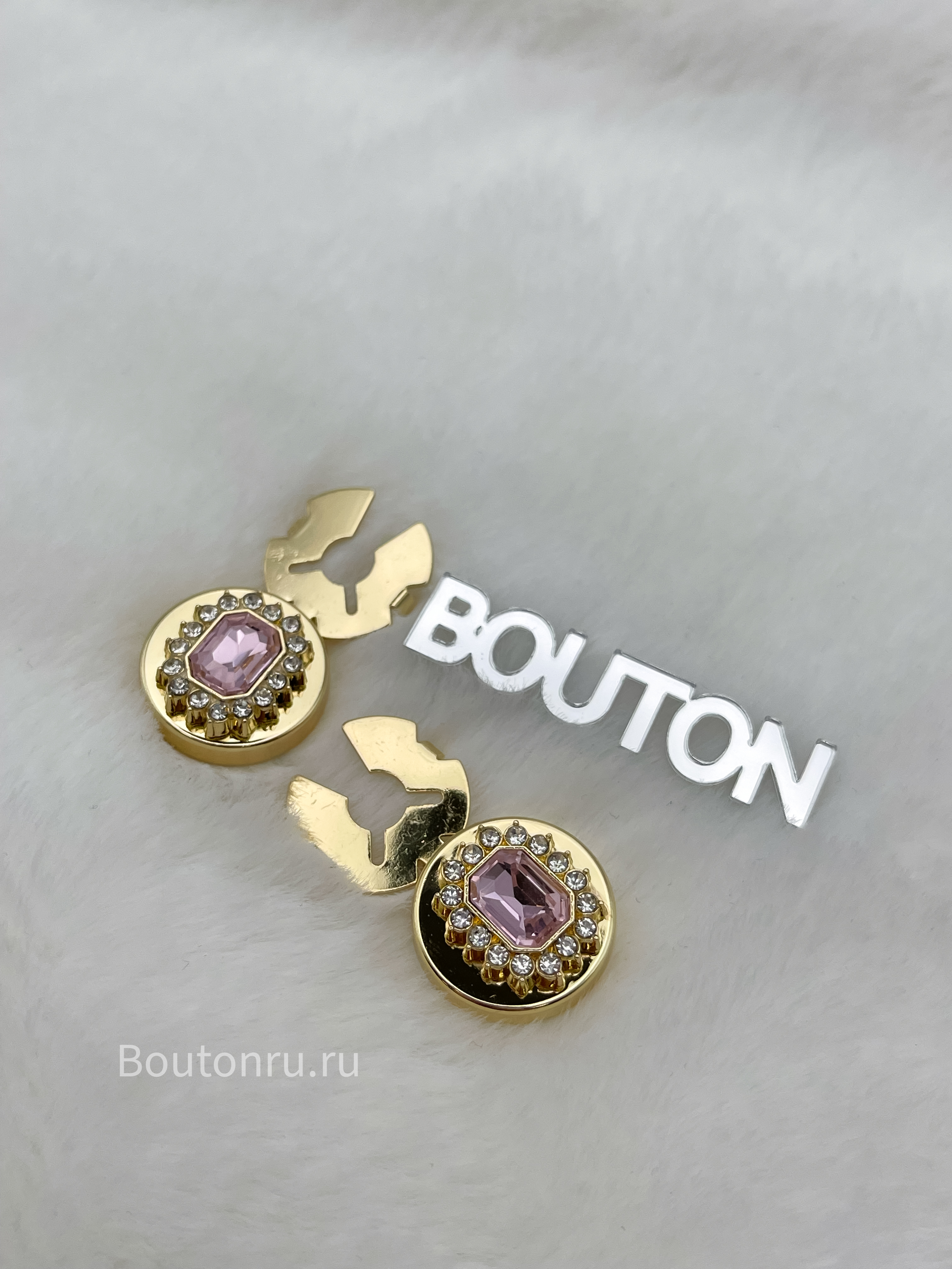 Накладка на пуговицу золотистая с прямоугольным розовым стразом