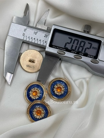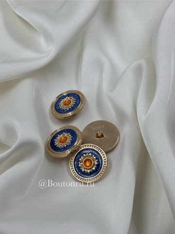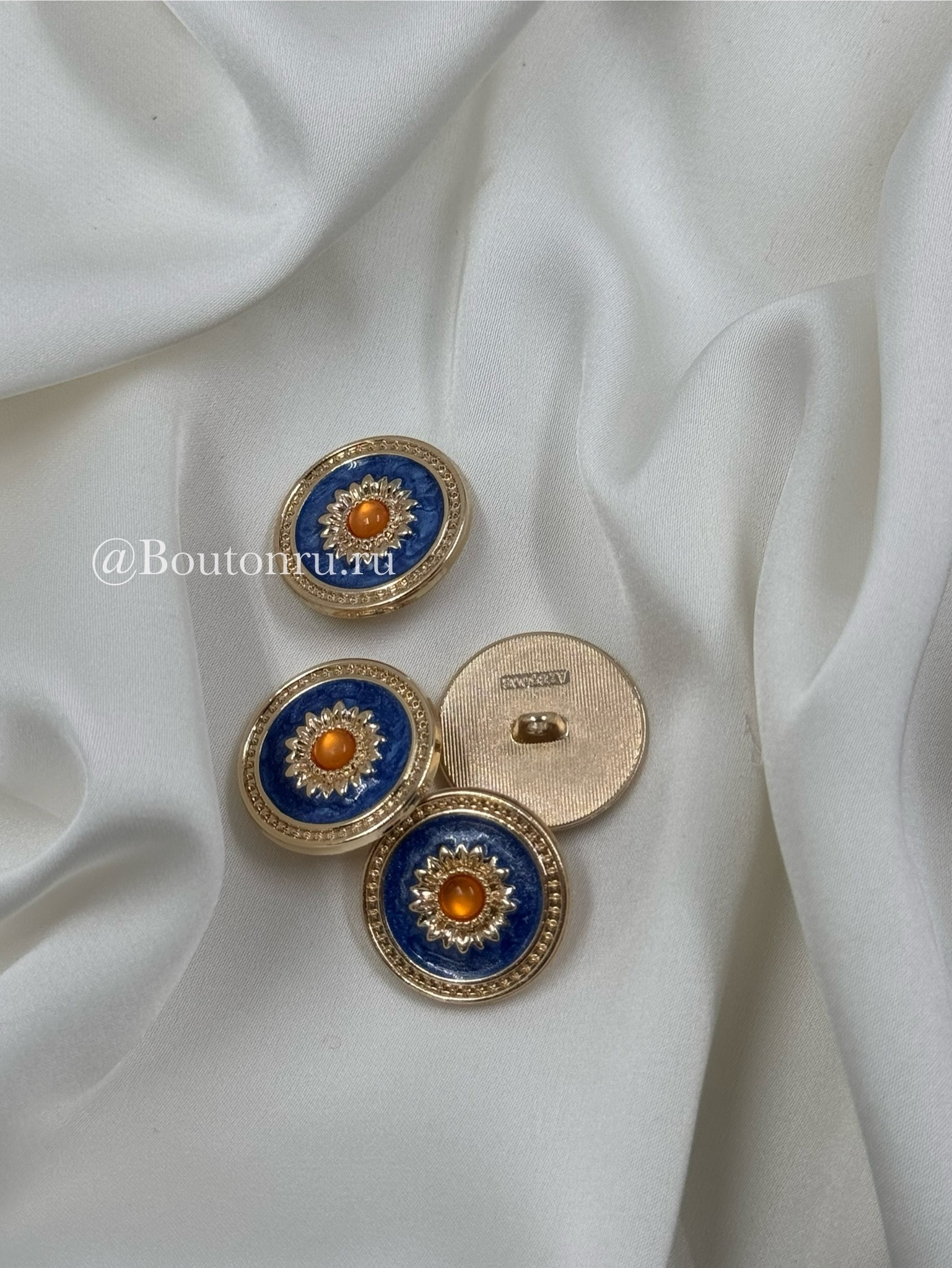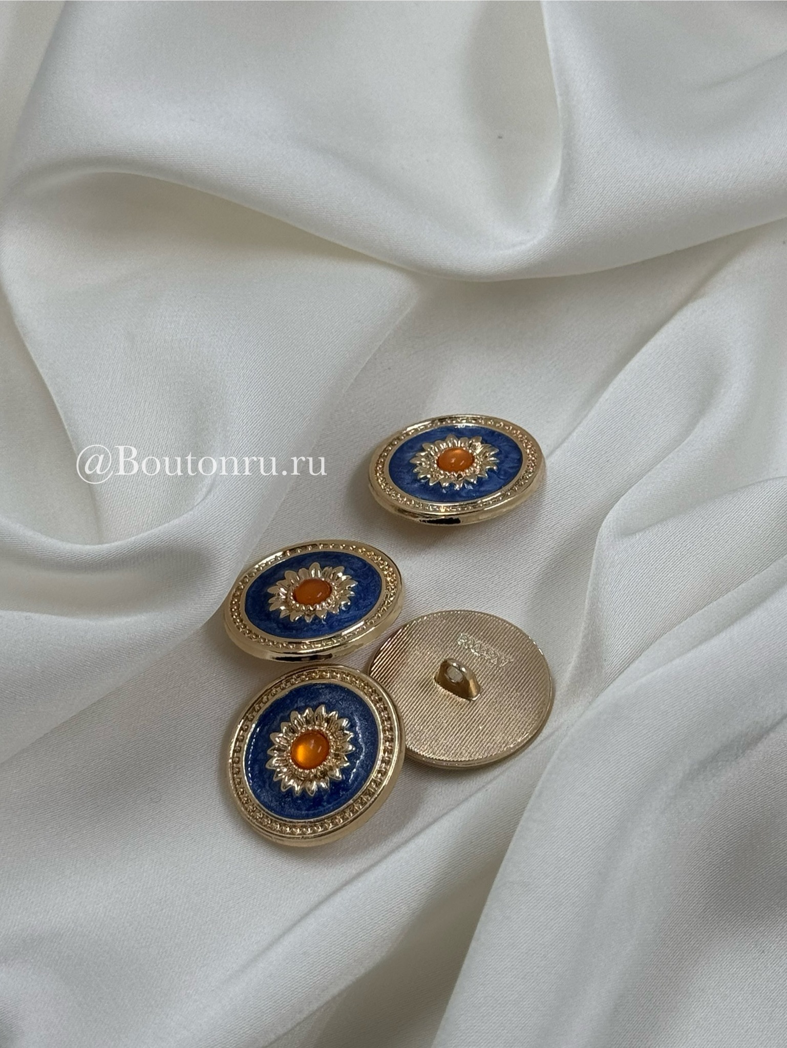Красивые пуговки узором, напоминающие цветок подсолнуха. Пуговки выполнены из золотистого металла и дополнены синей эмалью