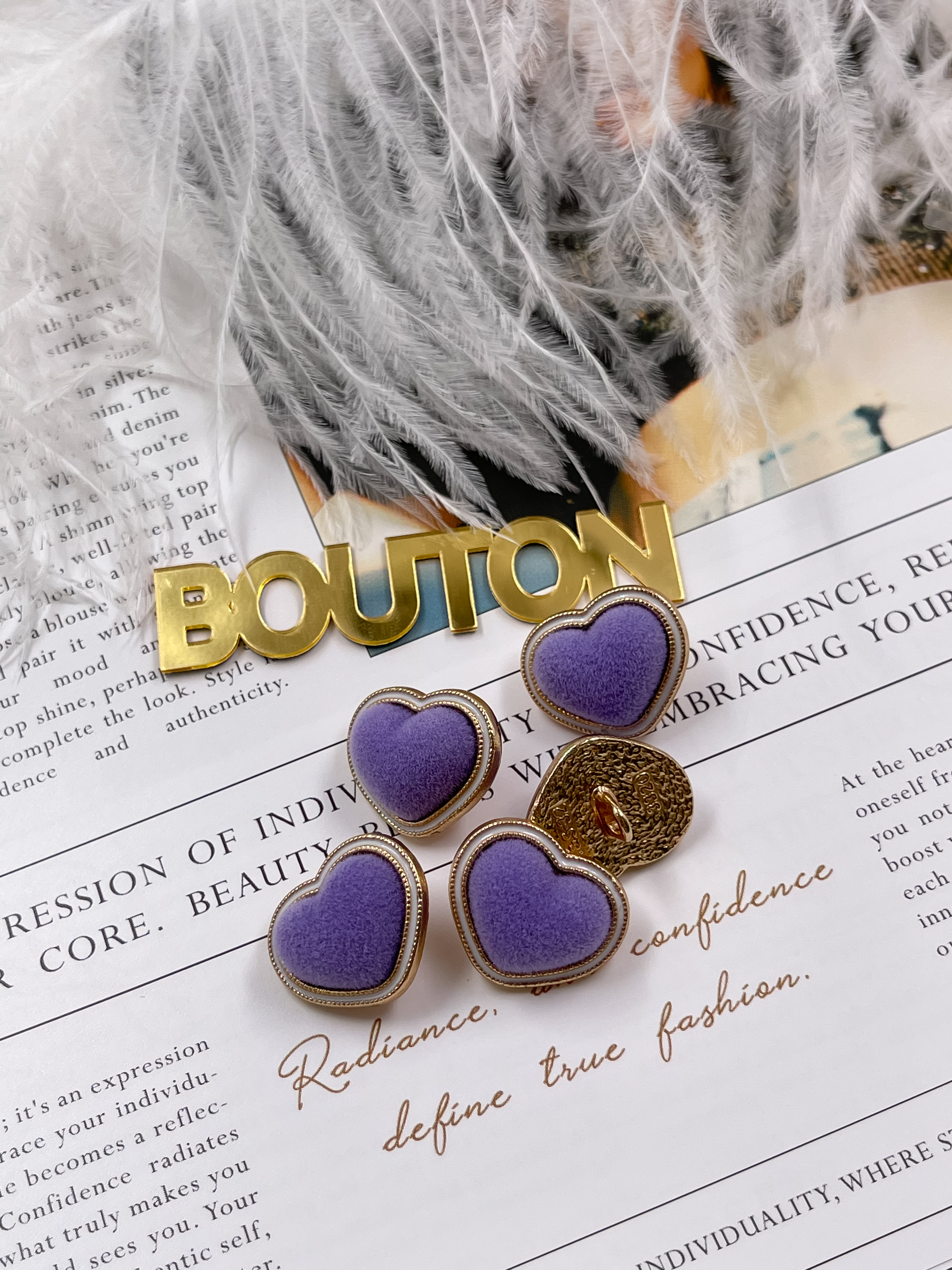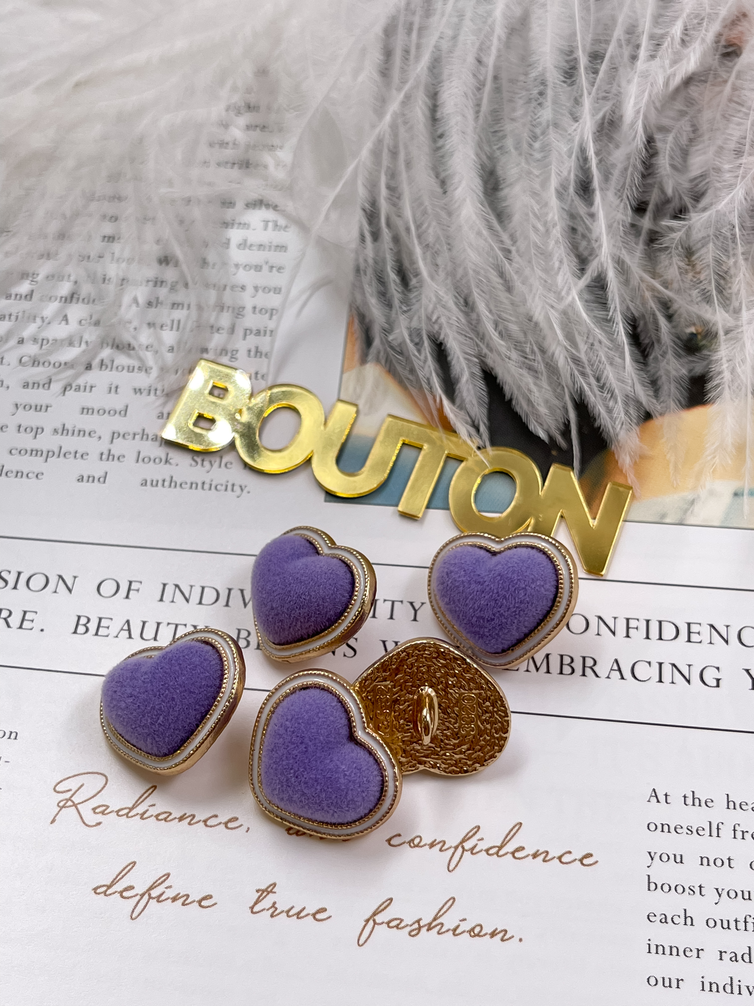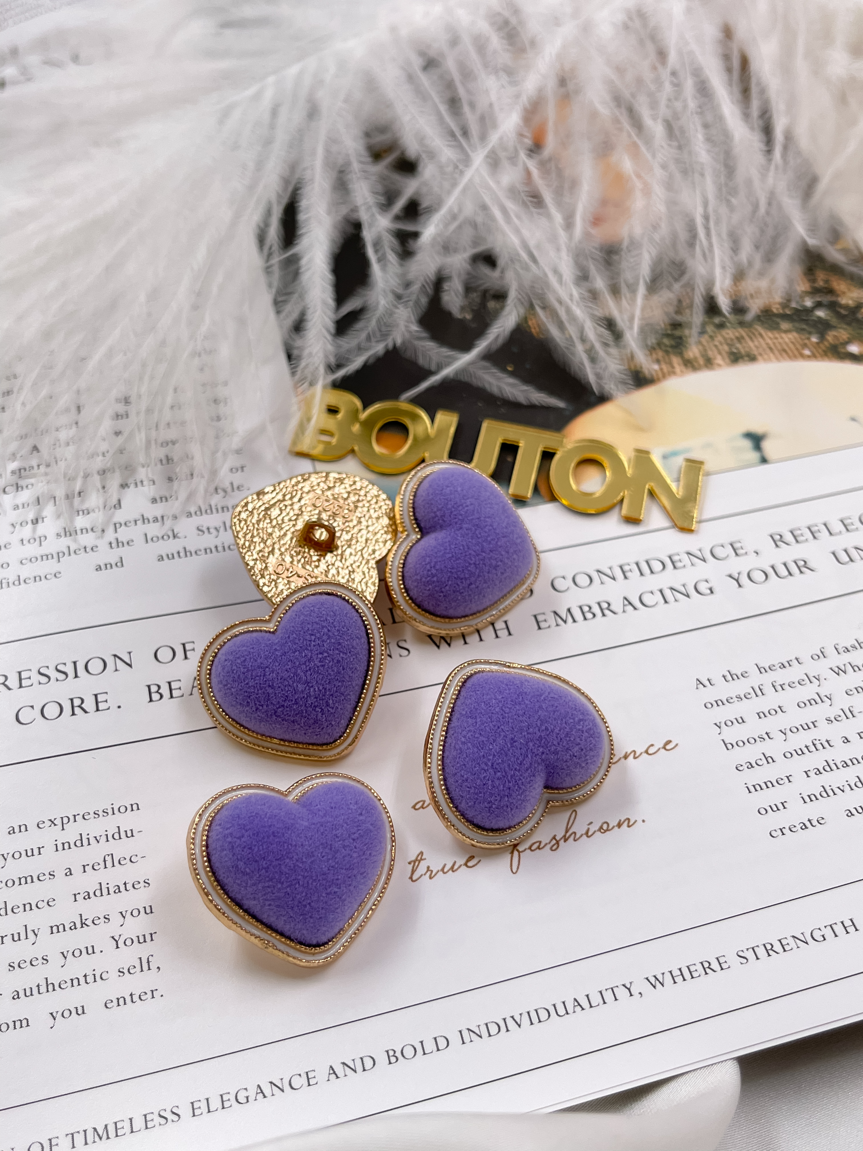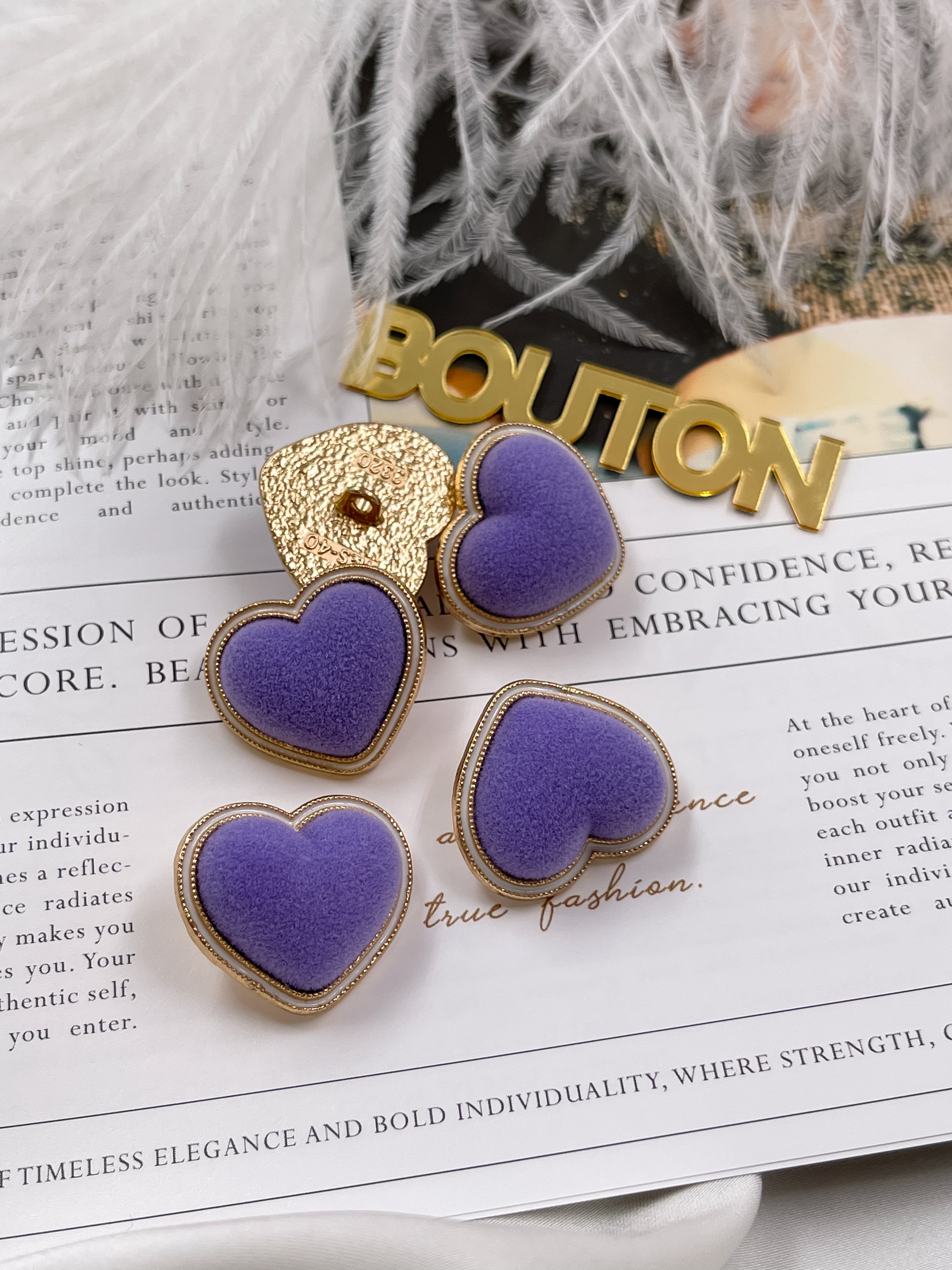 Пуговицы в форме сердца в бархате фиолетового цвета.