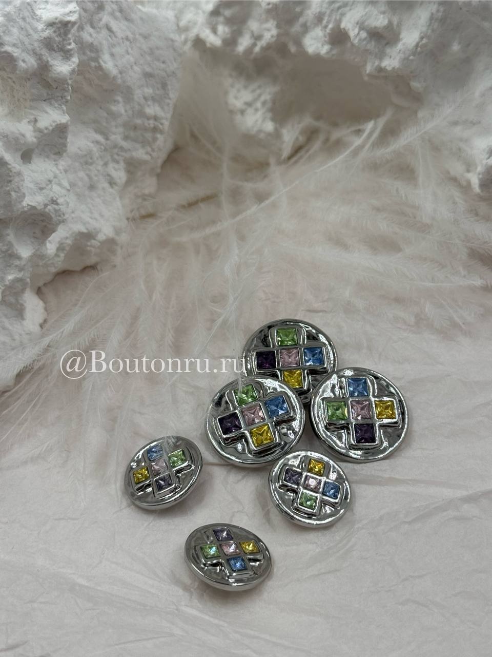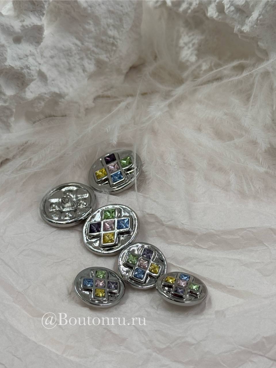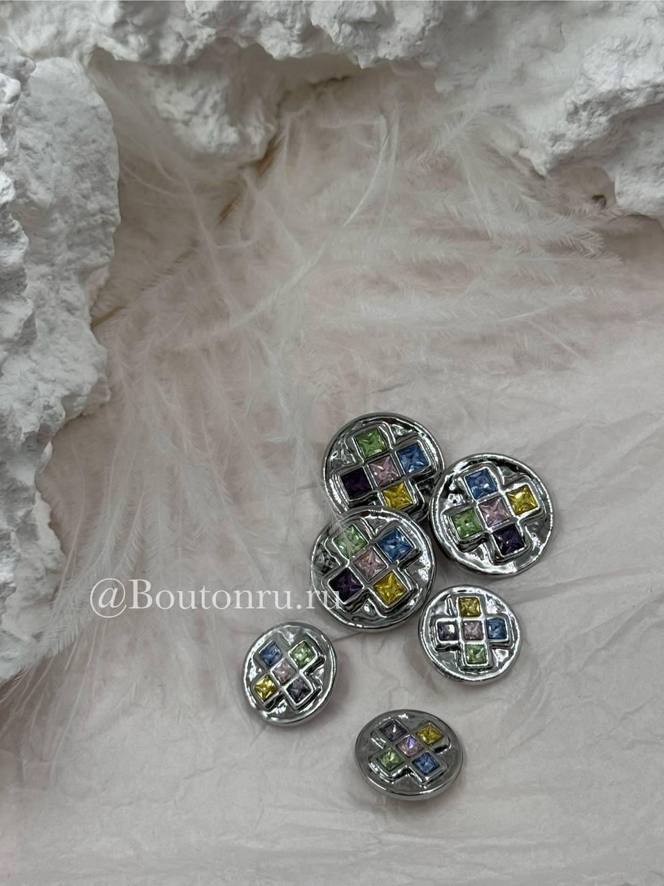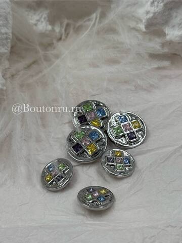 Пуговицы серебристые с квадратными деталями и разноцветными камнями стразами
