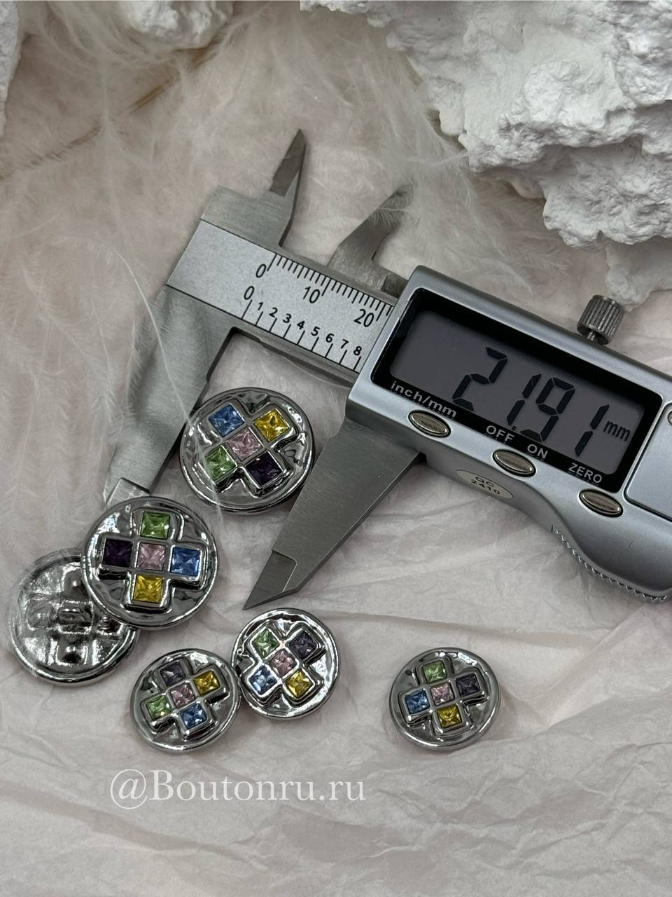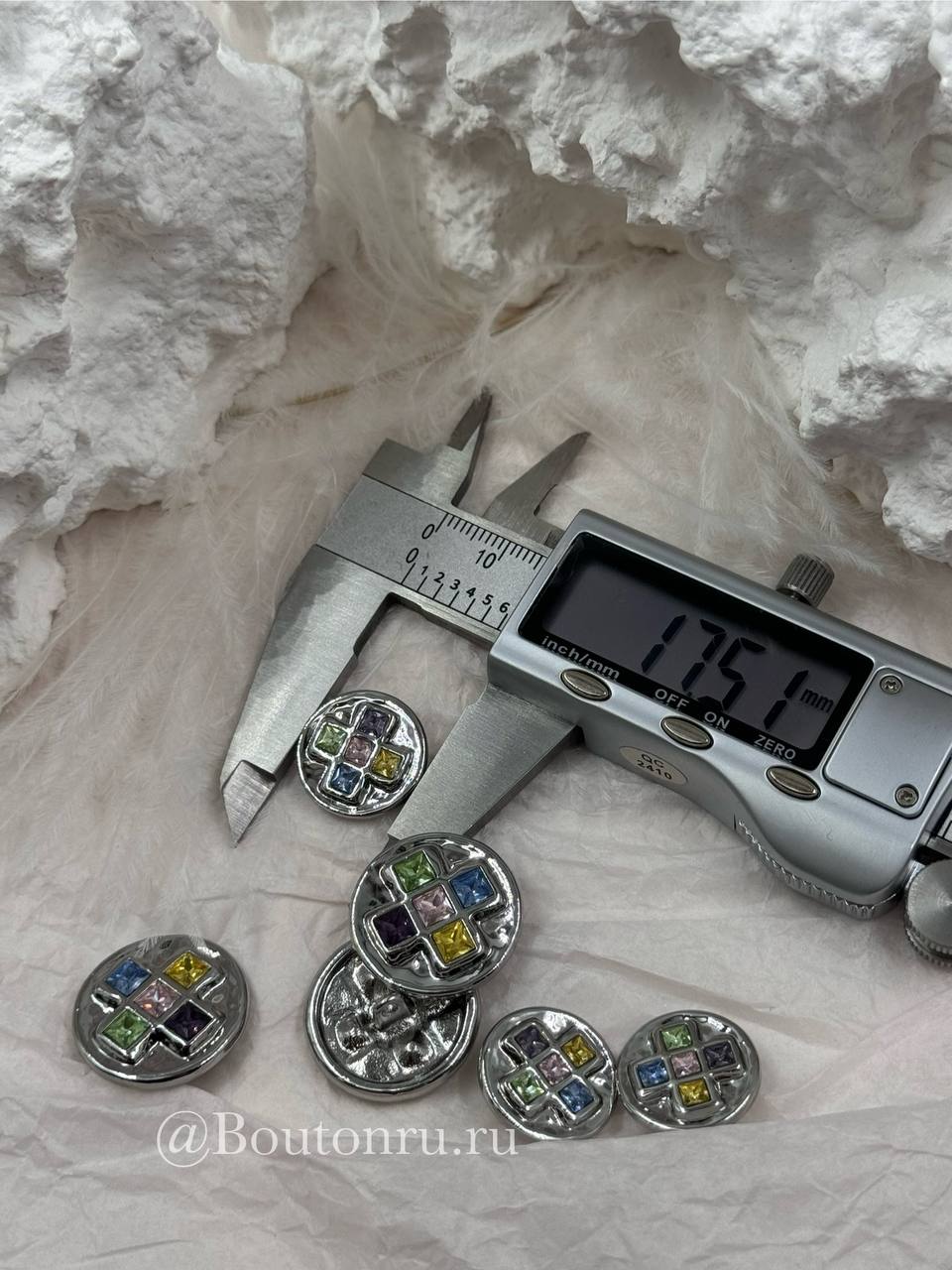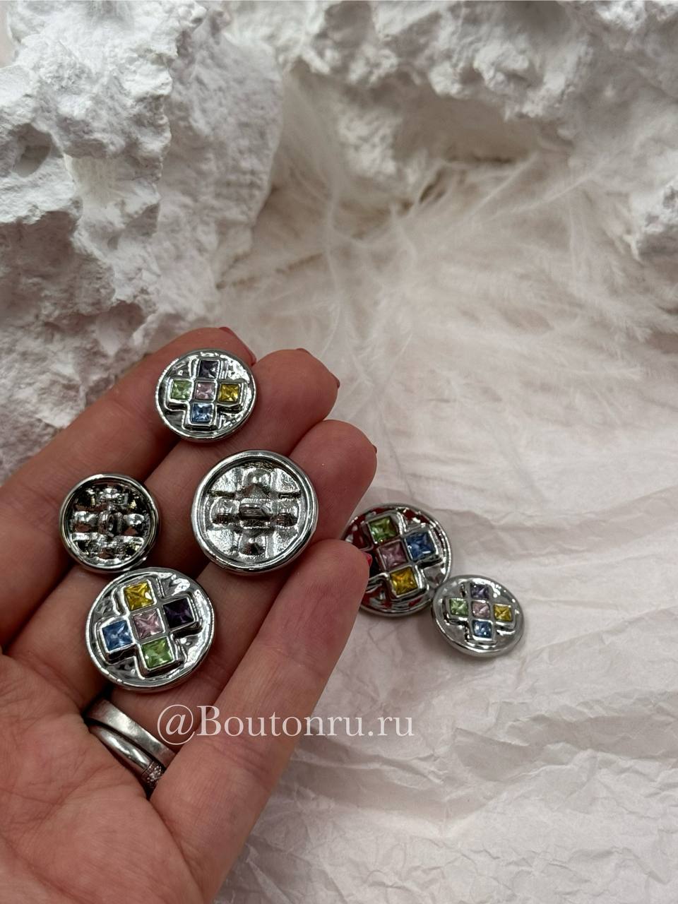 Пуговицы серебристые с квадратными деталями и разноцветными камнями стразами