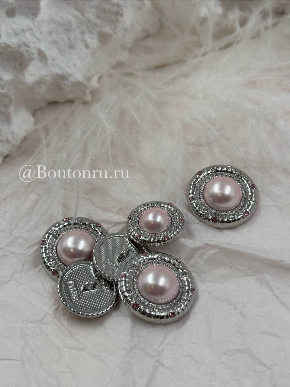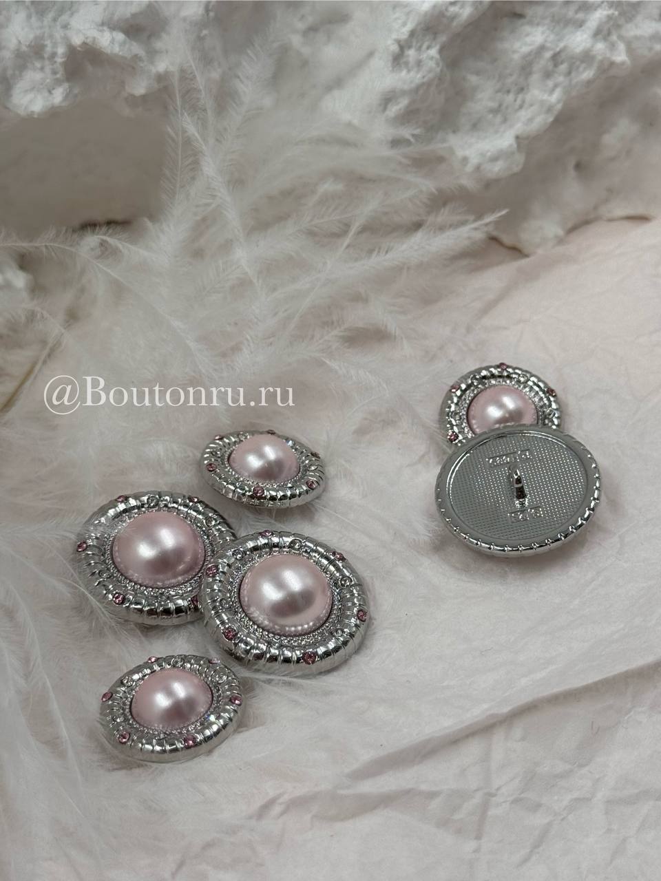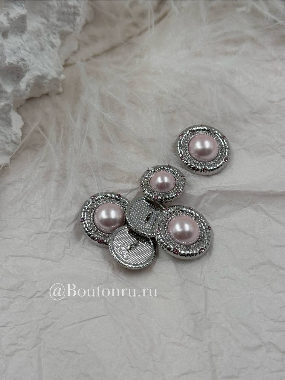 Роскошные пуговицы с нежно-розовым жемчугом в серебристом обрамлении, пуговки дополнены стразами