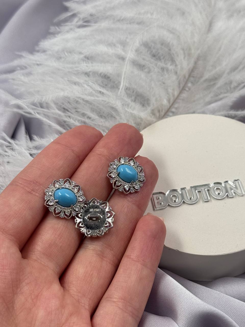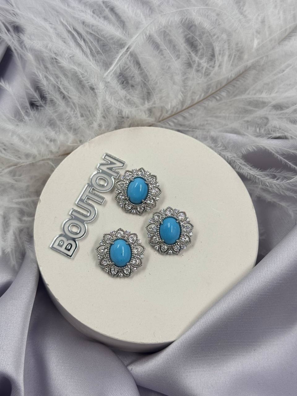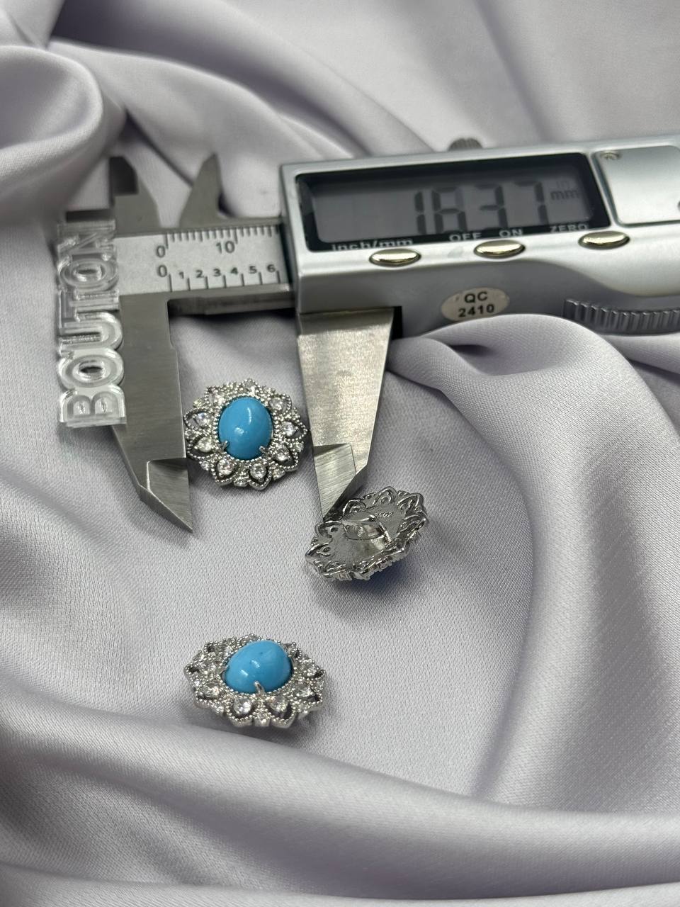 Пуговицы серебристые в форме цветка с горным хрусталем и голубым (бирюзовым) камнем