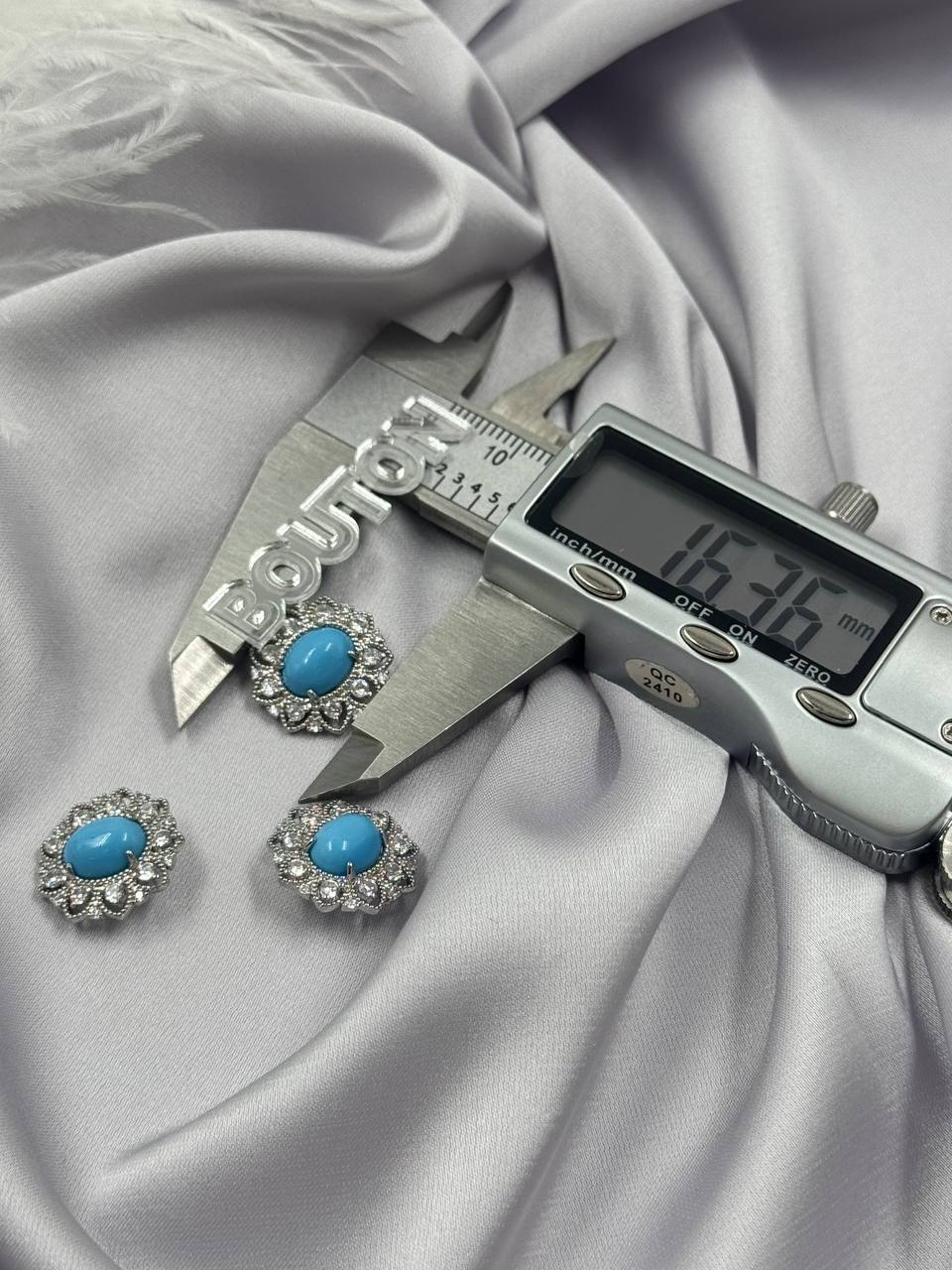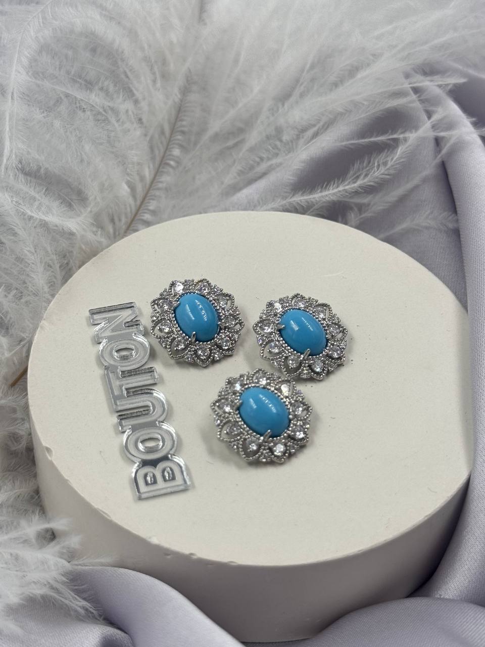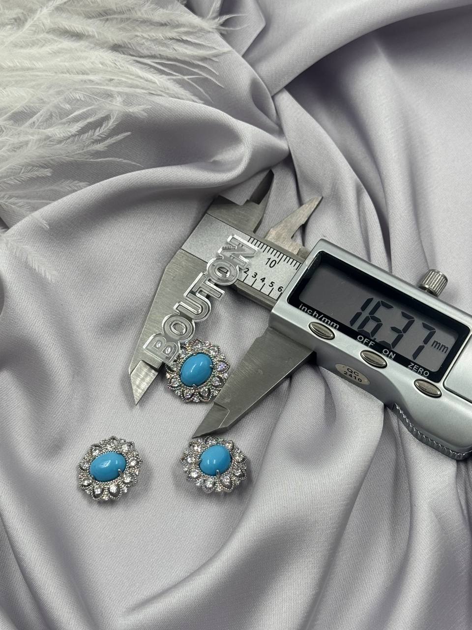 Пуговицы серебристые в форме цветка с горным хрусталем и голубым (бирюзовым) камнем