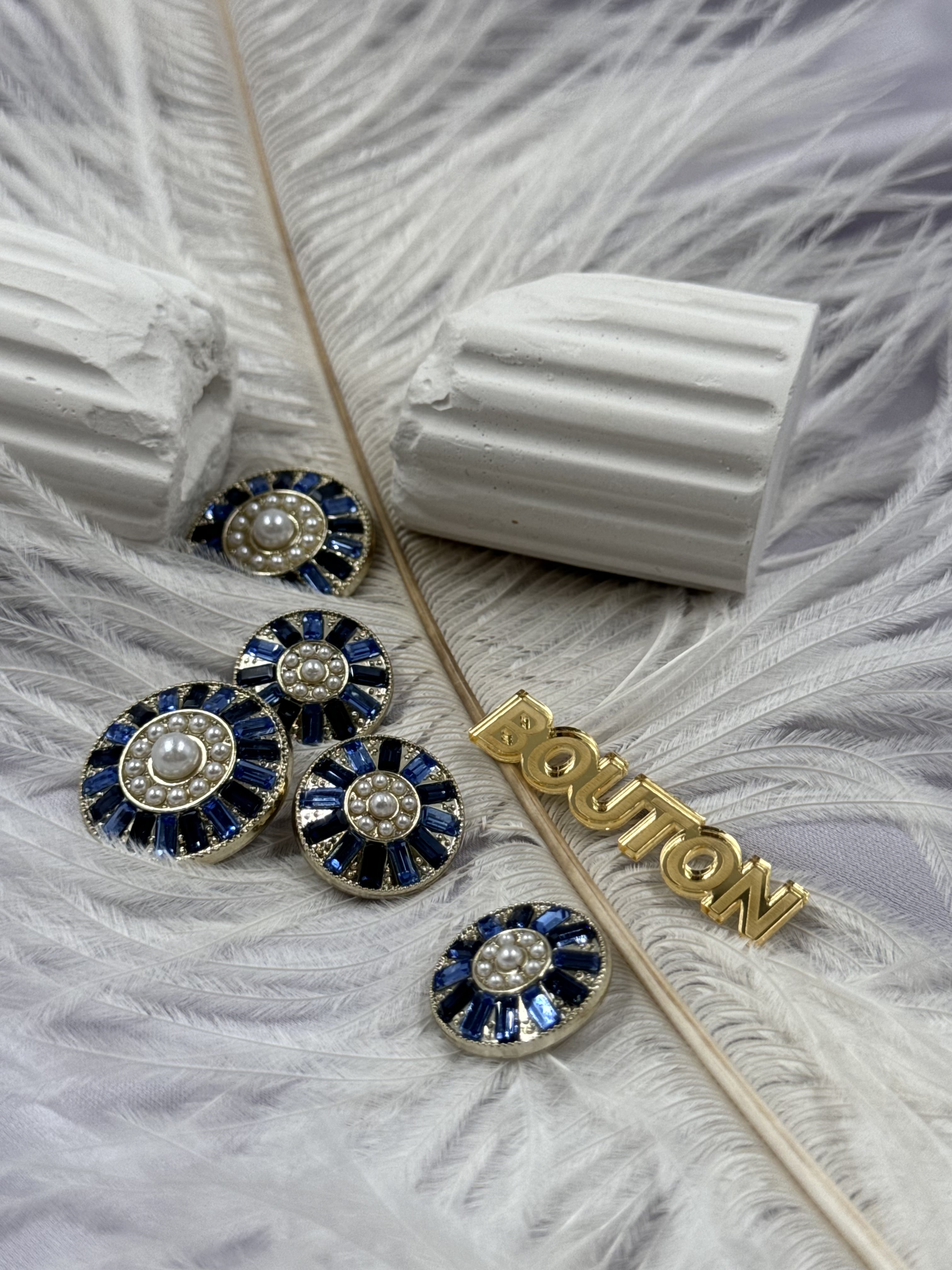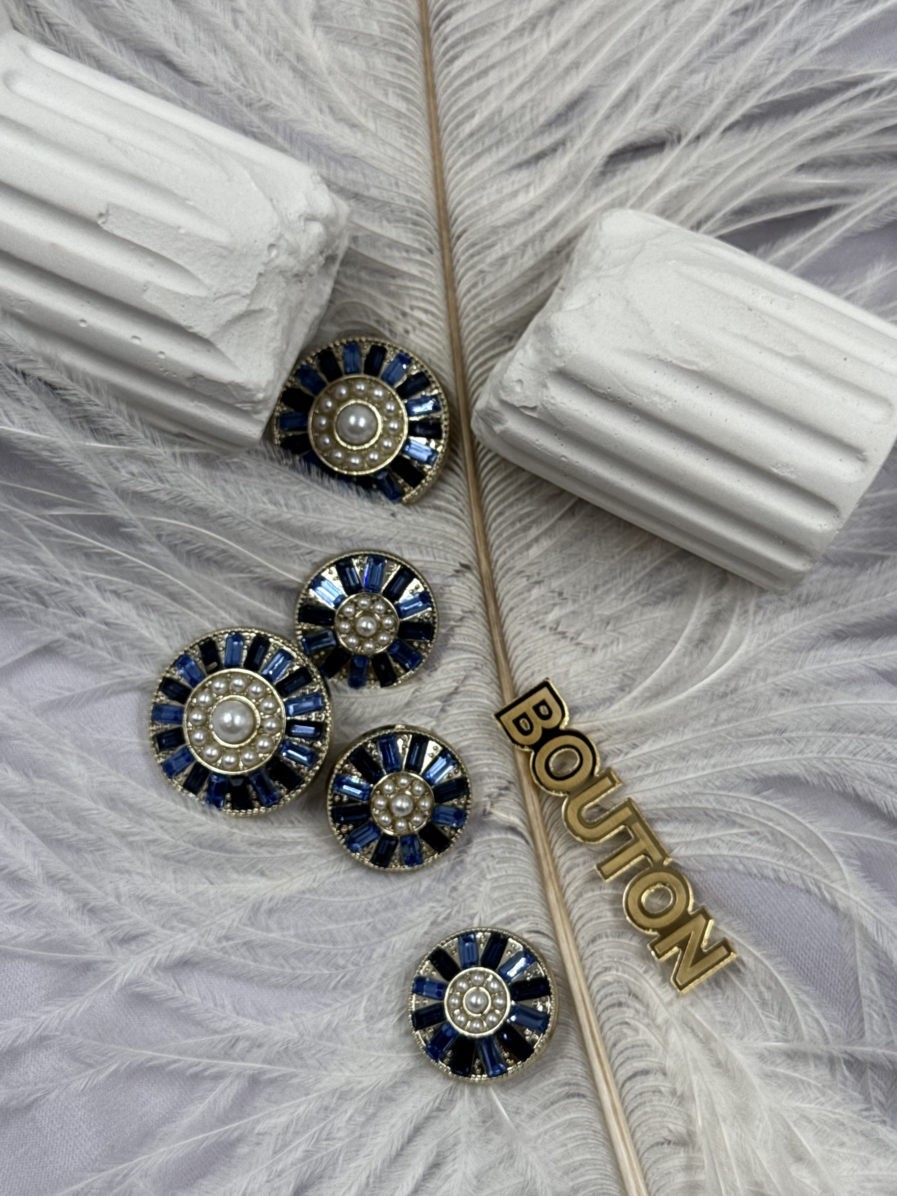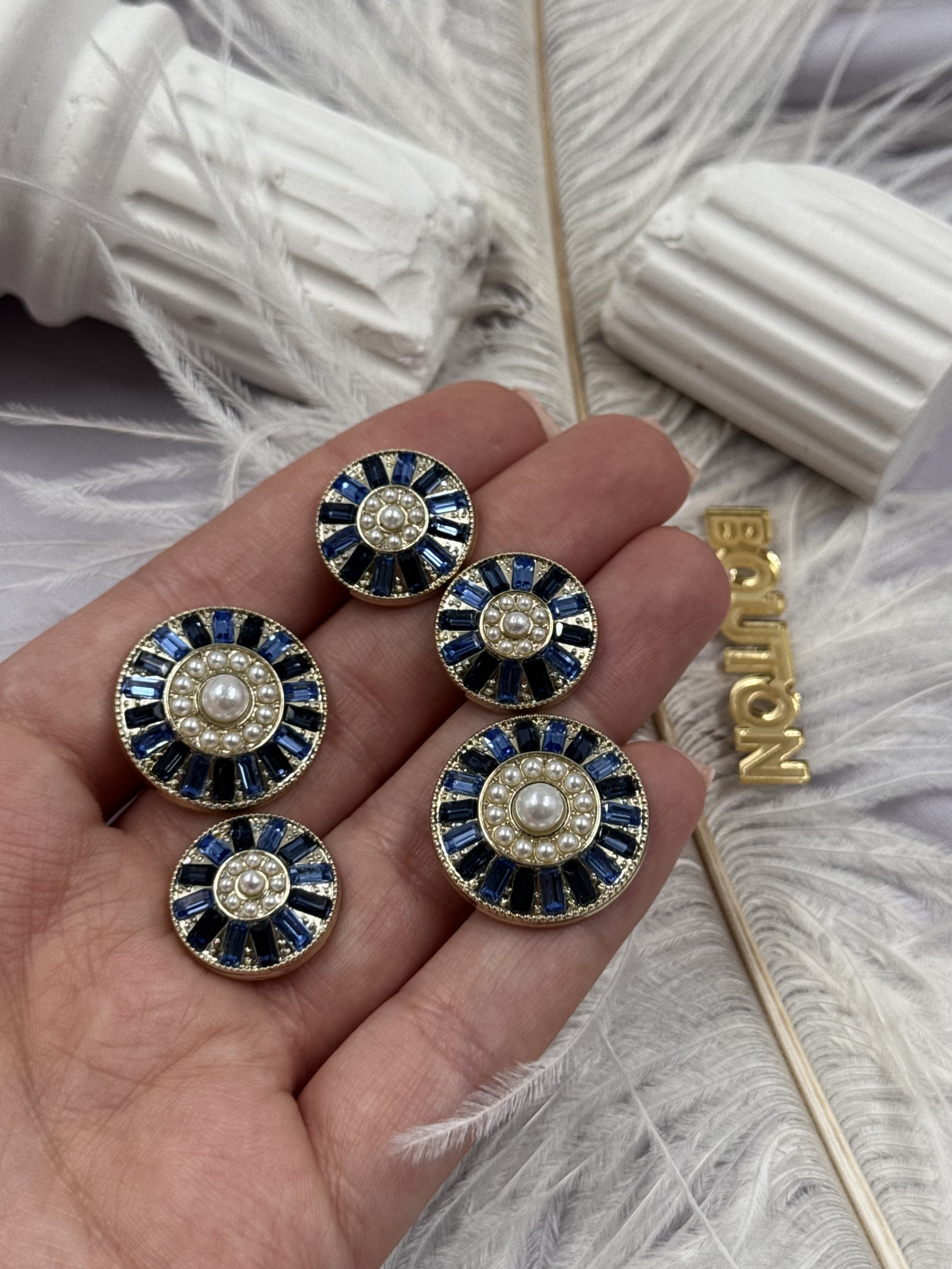 Пуговицы золотистые с жемчугом и синими камнями по краю