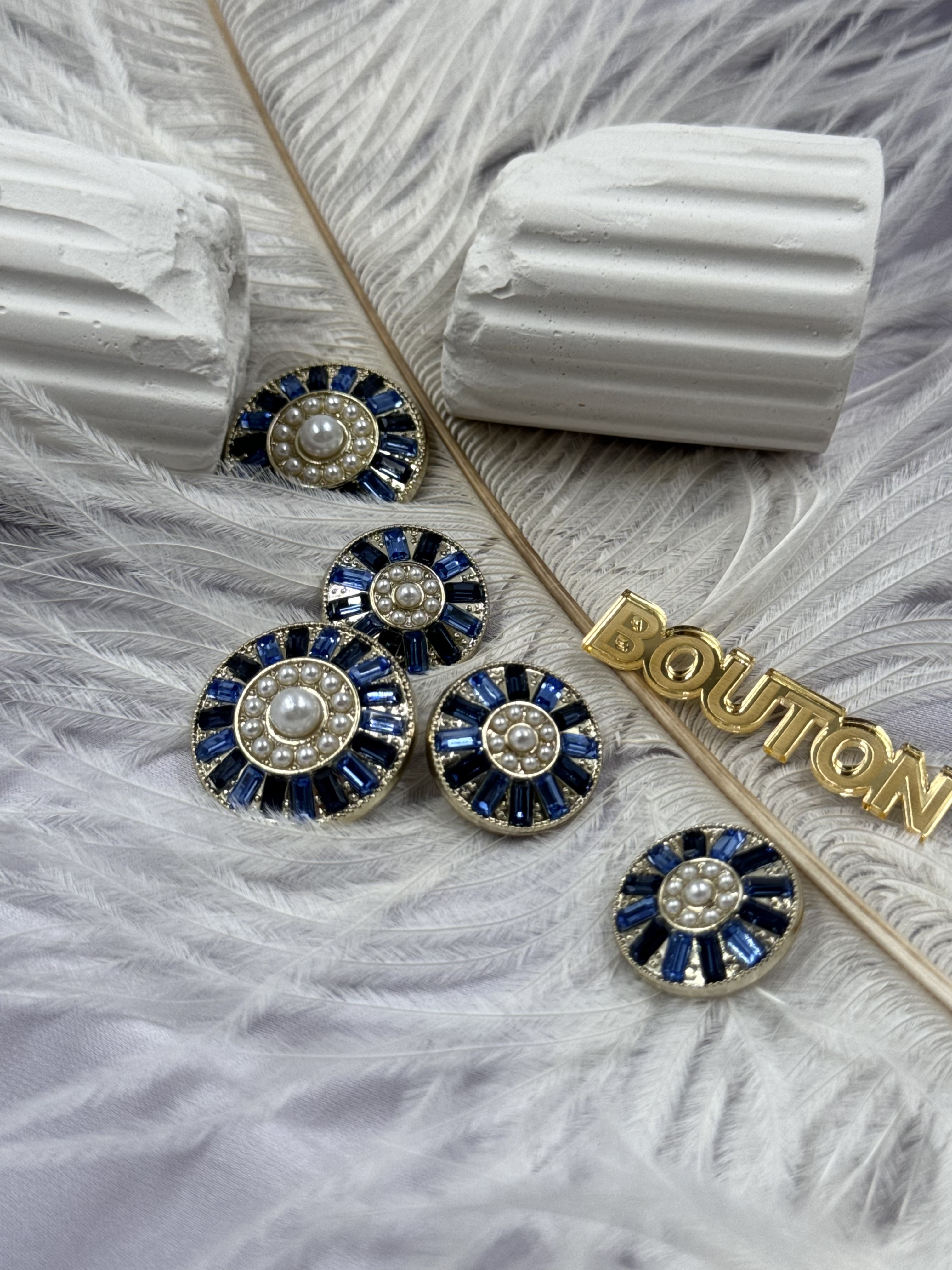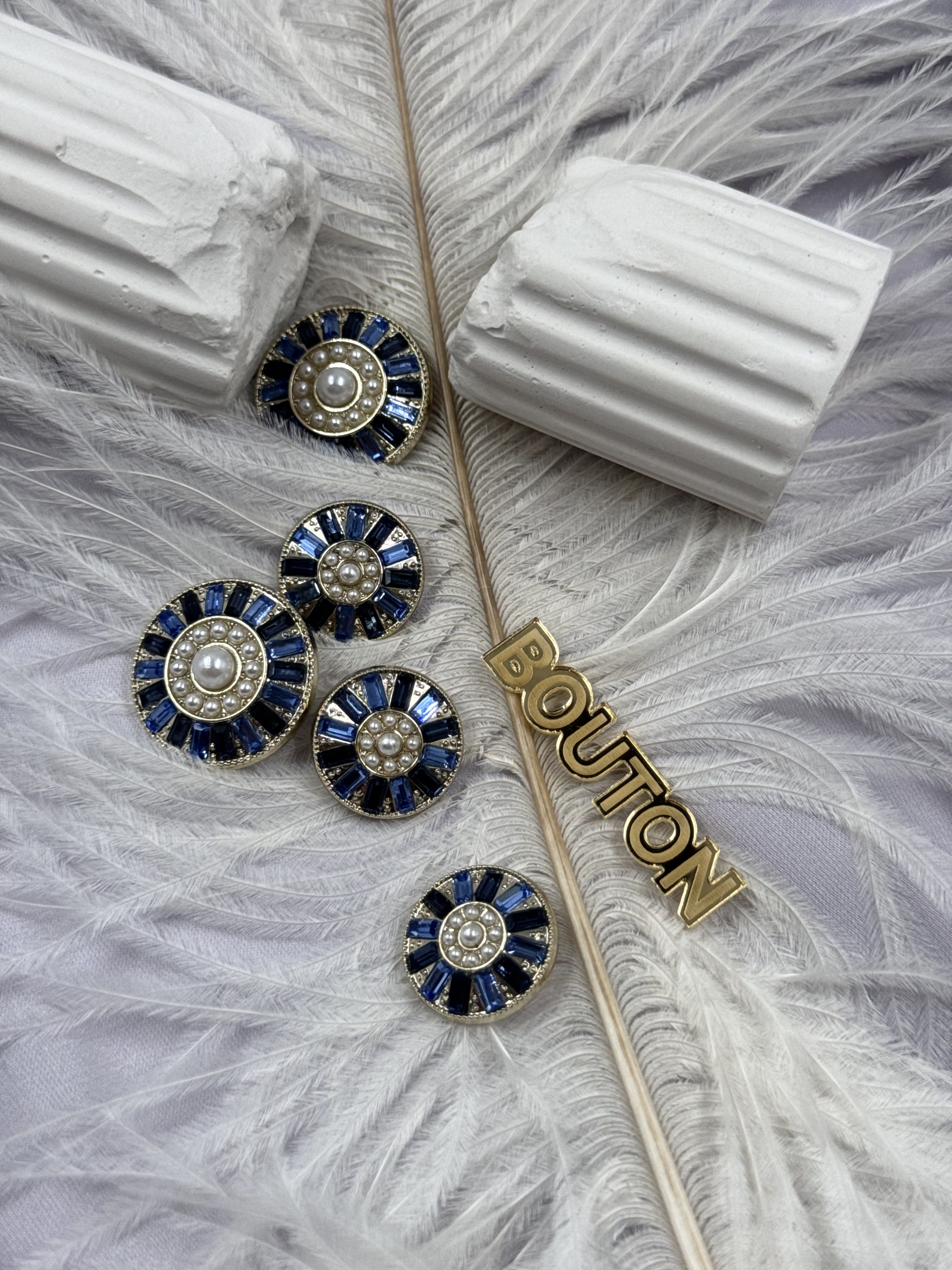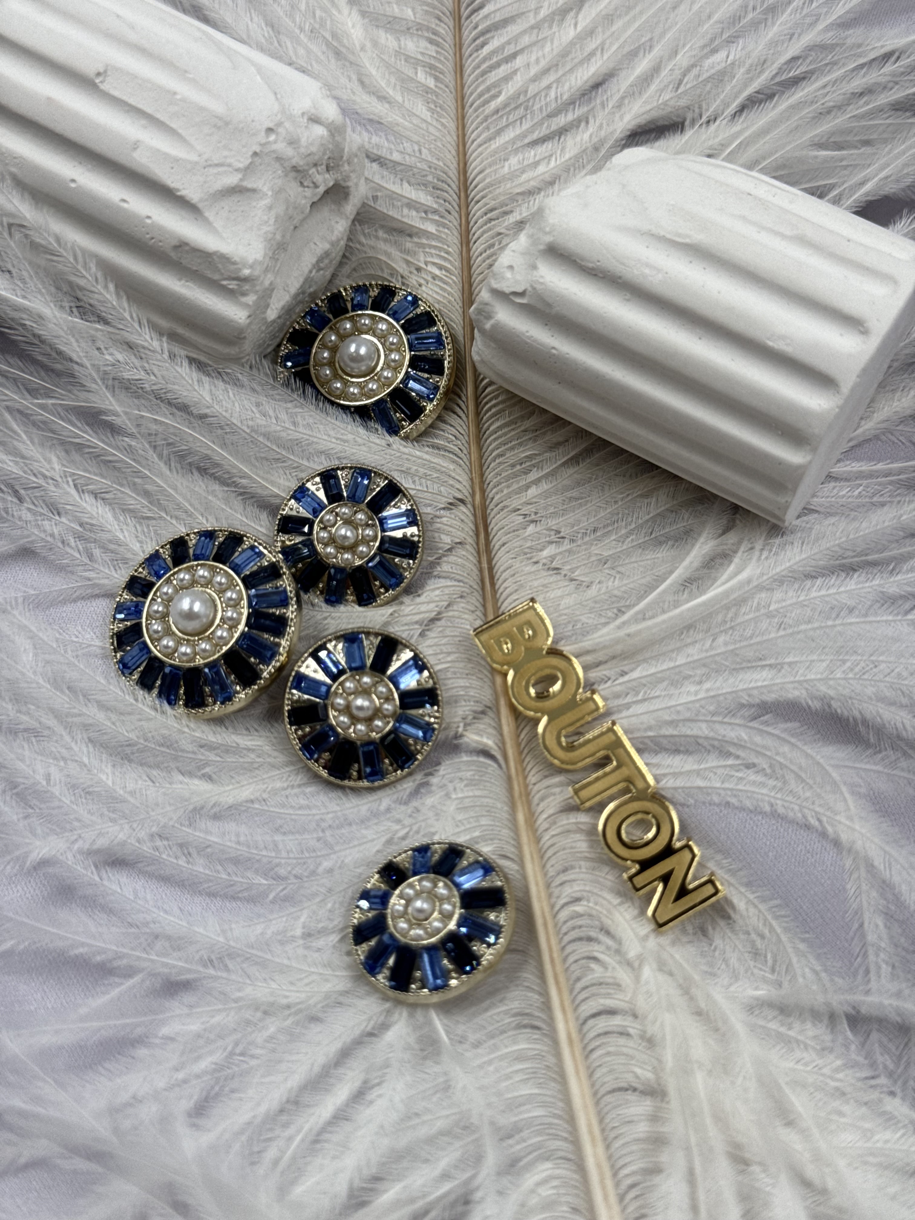 Пуговицы золотистые с жемчугом и синими камнями по краю
