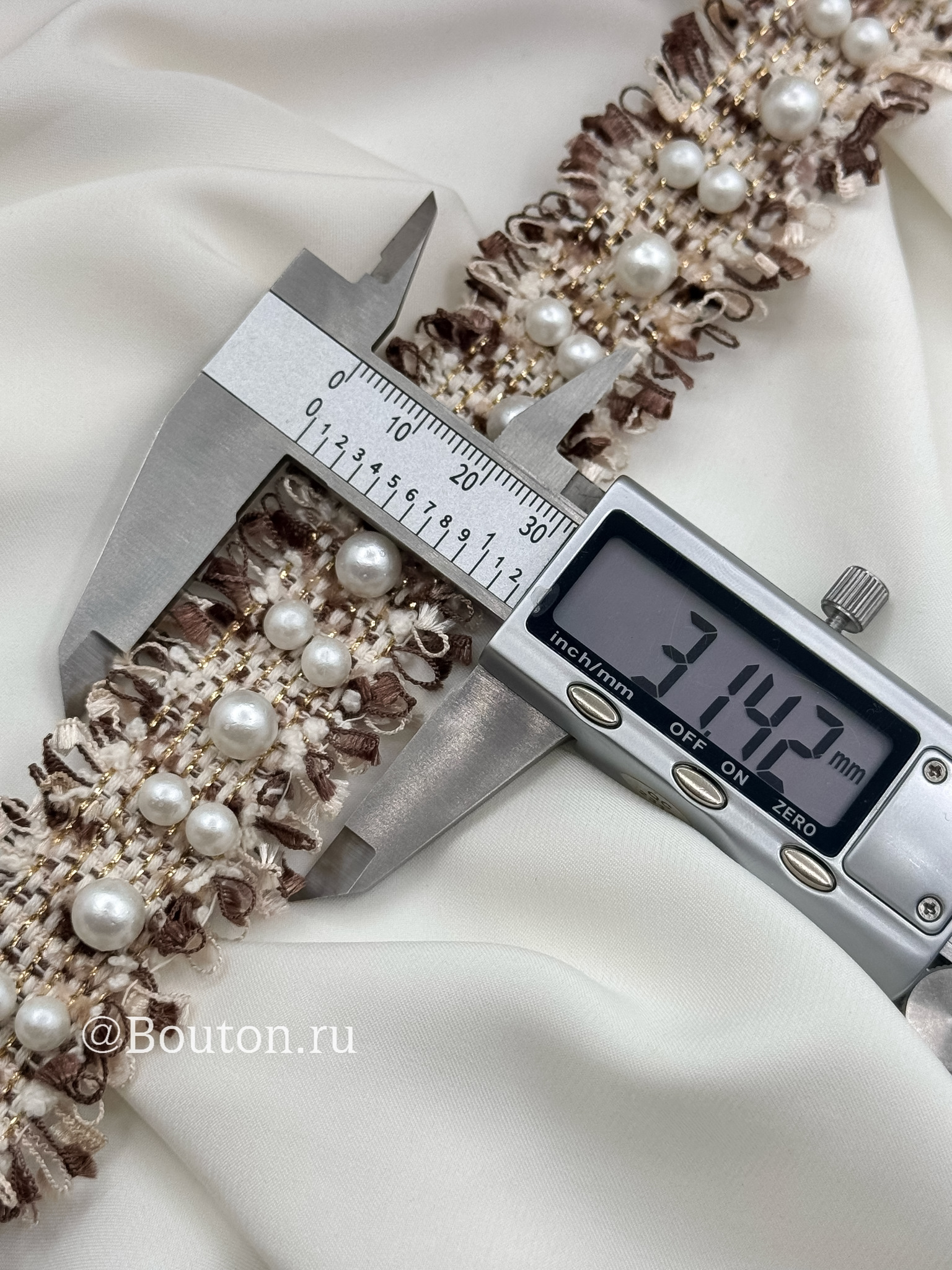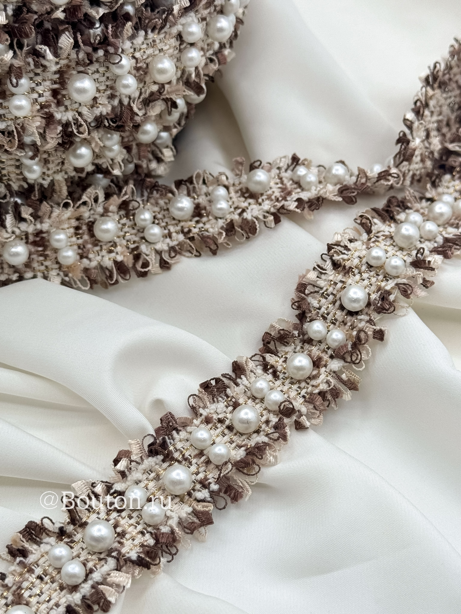 Тесьма светло-коричневого оттенка капучино, изящно дополненная двумя рядами сверкающих жемчужин, придает образу утонченность в стиле Шанель. Элегантное украшение для одежды, аксессуаров или декора, которое подчеркнет вашу индивидуальность и безупречный вкус!