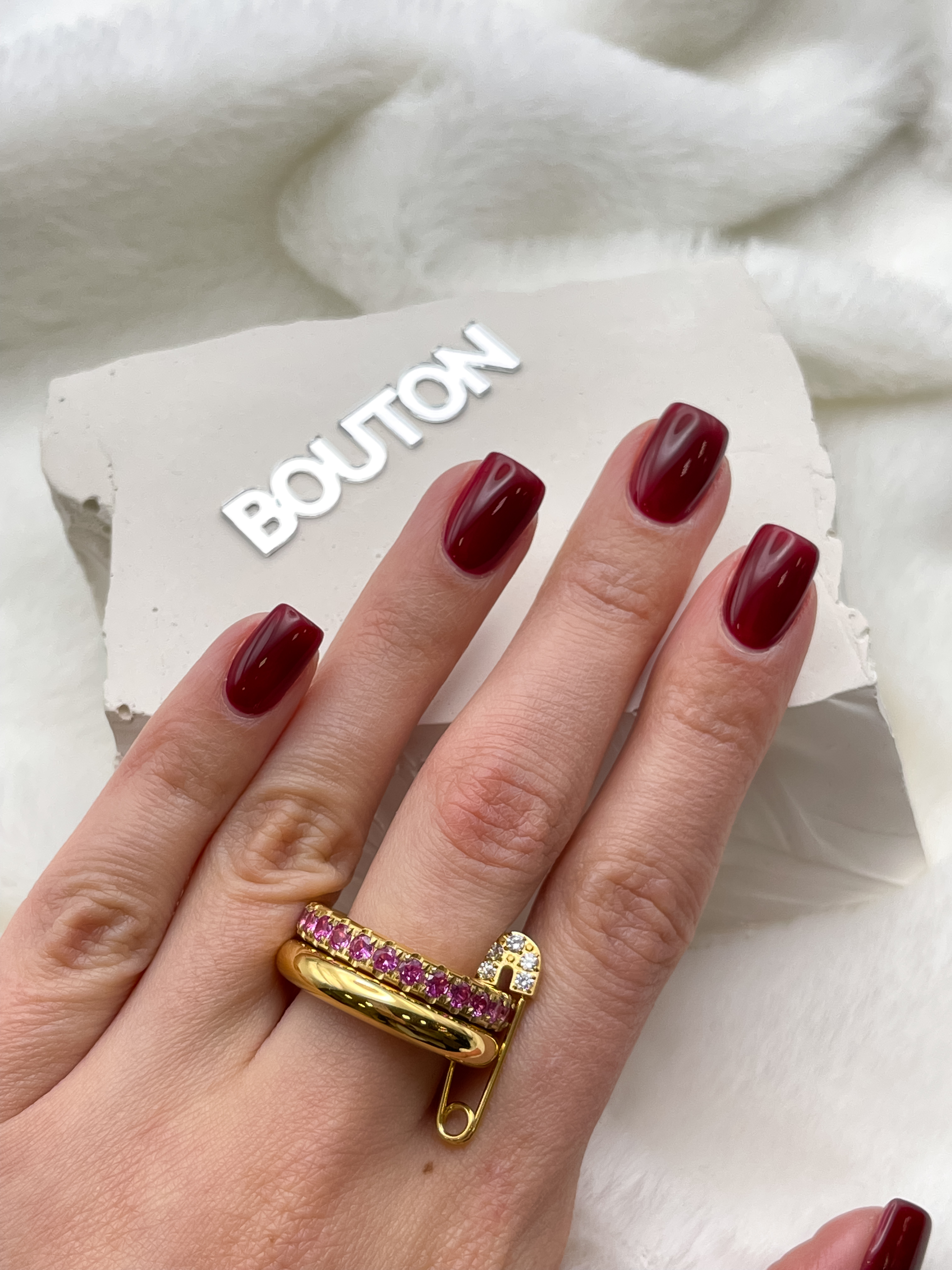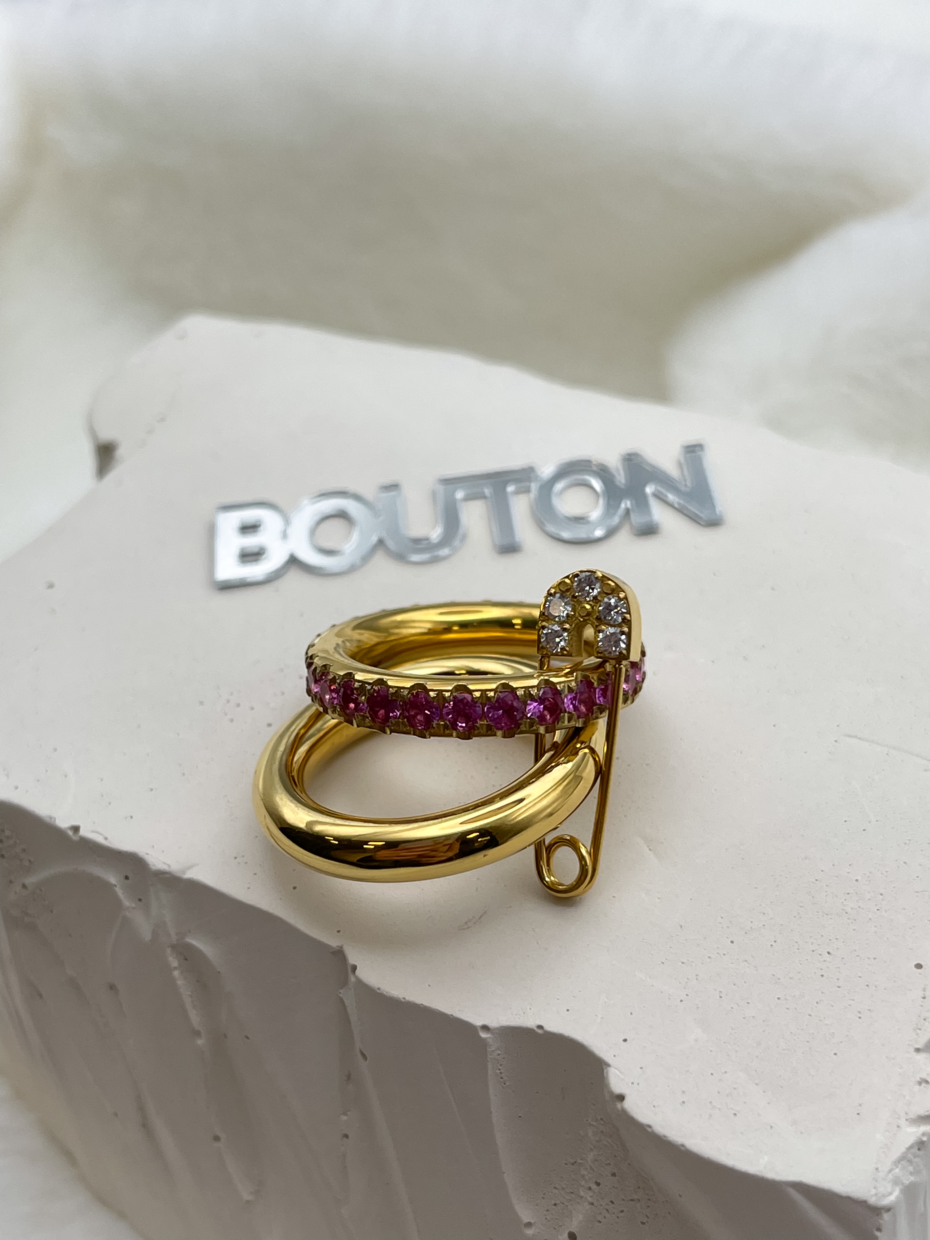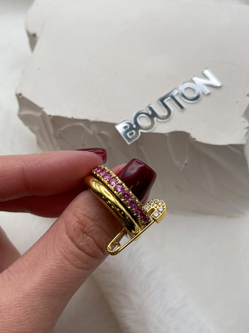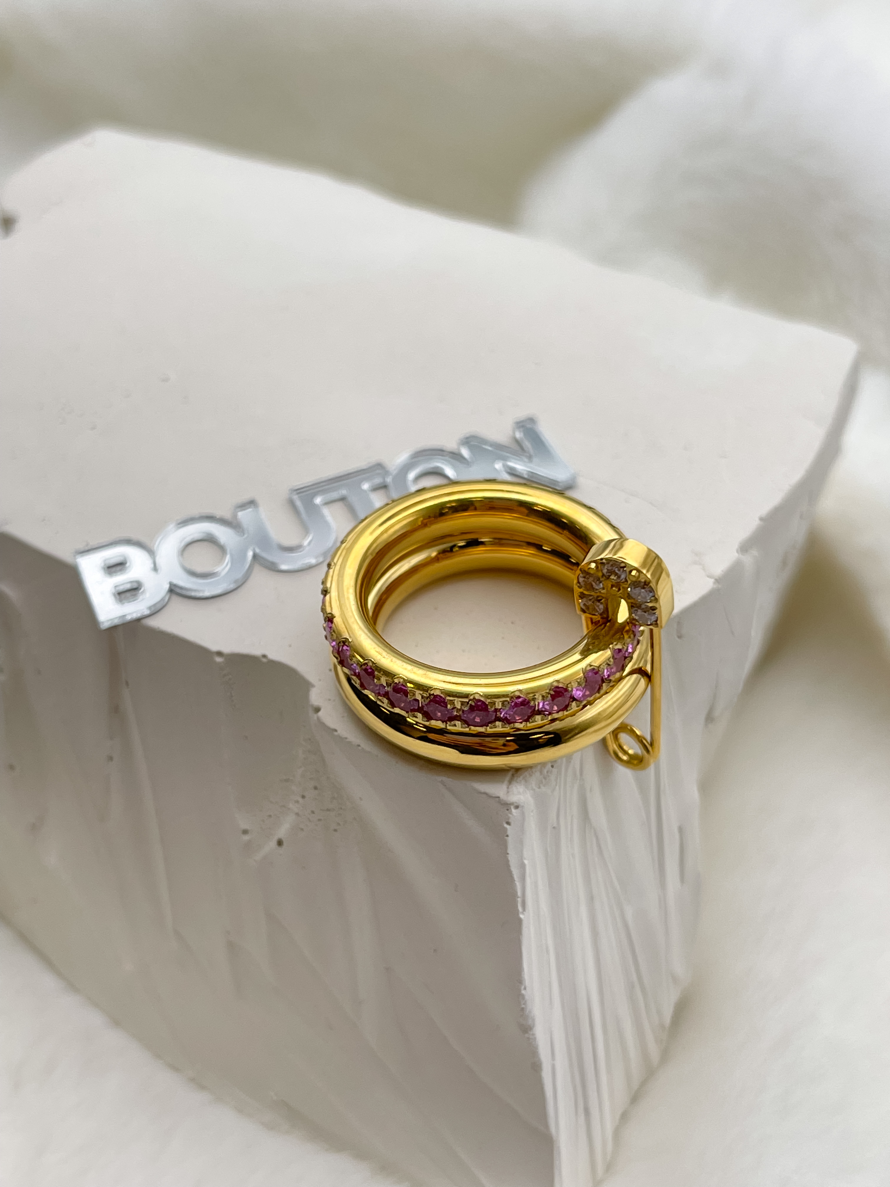 Золотистое двойное кольцо с розовыми камнями и булавкой